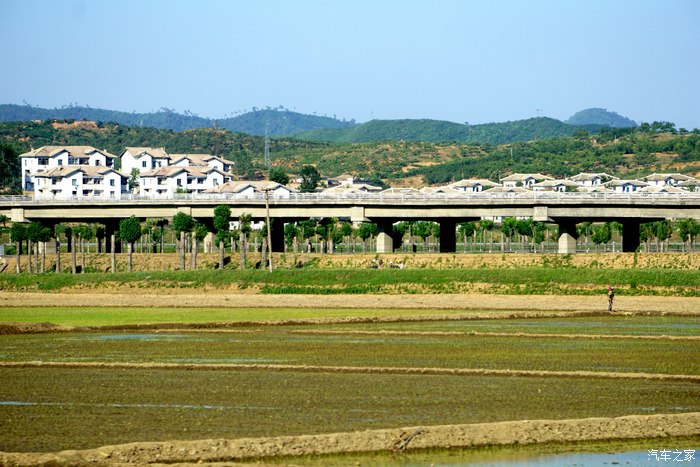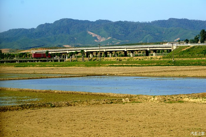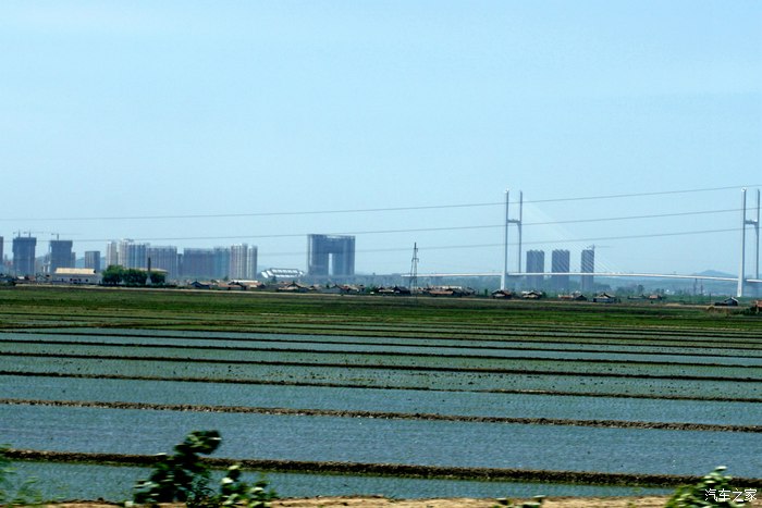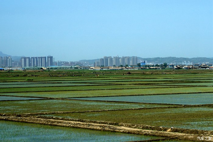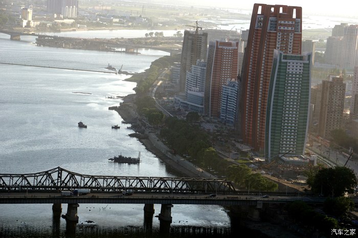 拉近看到的丹东的国门湾新市区与鸭绿江新大桥。完全由中方投资建设的大桥已建成,但朝方与之连接的公路无开工的迹象,大桥插在朝鲜的稻田里,无法使用。