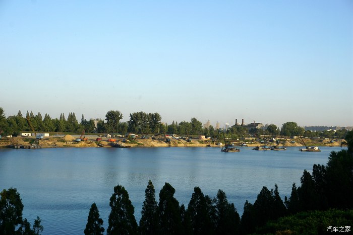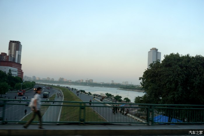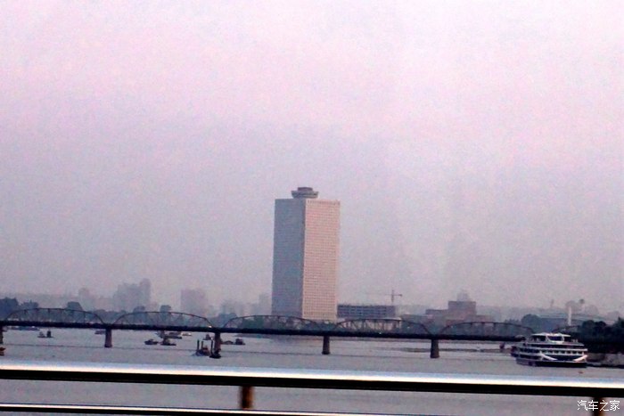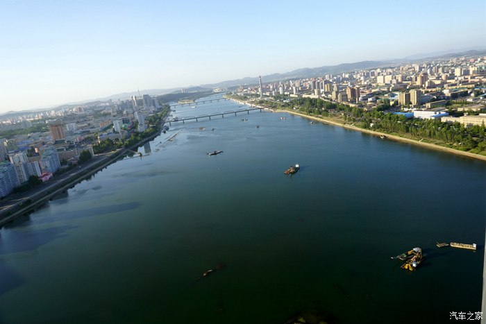 从电梯旁边的窗户看另一方向,大同江与分支夹着的江心岛——羊角岛的一端。