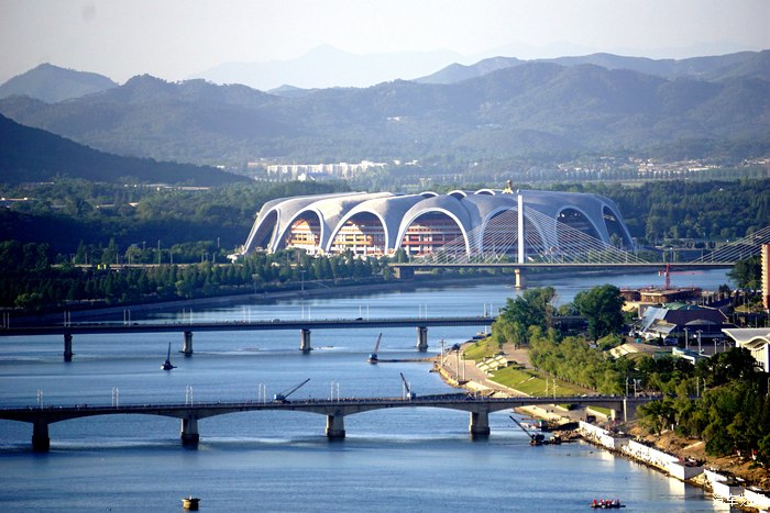 坐落于大同江中心绫罗岛的五一体育场,是2008年北京奥运火炬传递经过的第一个大型体育设施。这座造型犹如一个巨型降落伞的体育场,是朝鲜上演10万人参加的团体操和艺术表演《阿里郎》的场所,能够容纳15万名观众,堪称世界之最。