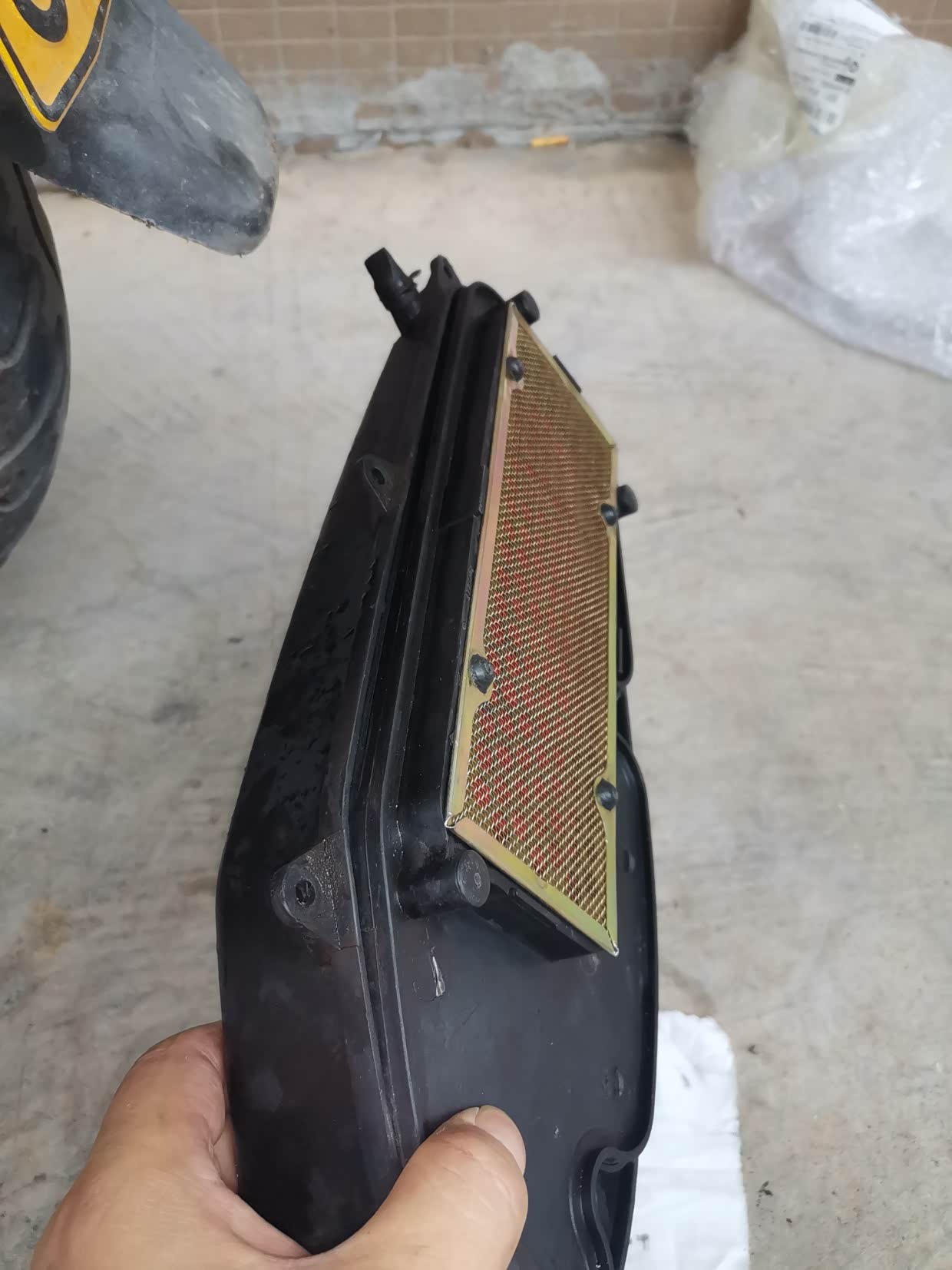 滤芯盒螺丝全部拆下来了,就这样就能看到滤芯很脏,这前面的车主估计从来没换过滤芯、