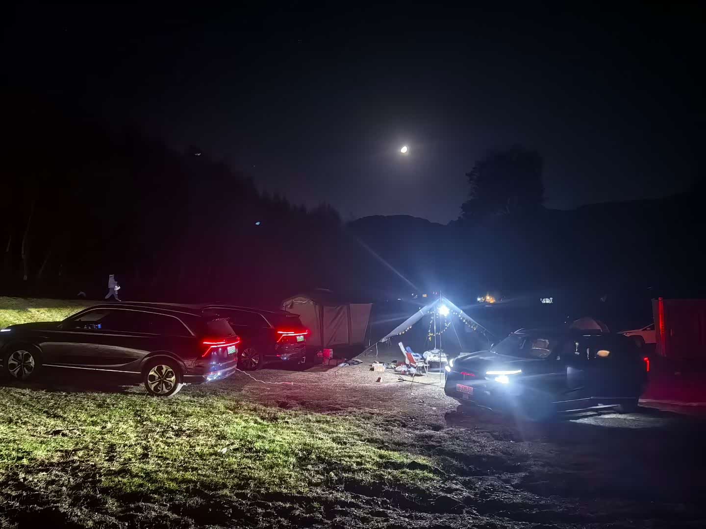 天彻底黑了,温度降到几度,把车尾帐篷跟车连起来,打开空调一会儿就暖和了。比起传统的帐篷带着柴火炉,安全太多啦,帐篷外点起篝火,噼啪响着,用车机的KTV功能唱歌,声音在山谷里飘着。抬头能看到满天空的星星,心里惬意又满足。