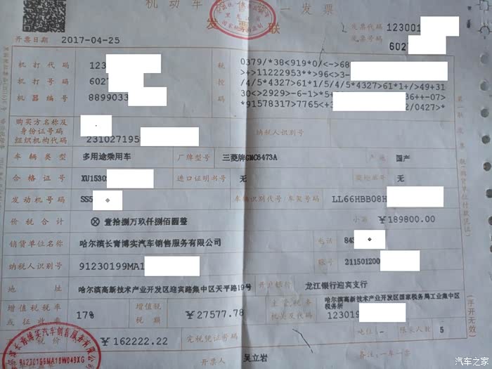 接下来就是订车了,本地东北八线小县城所有卖车的店都没有欧蓝德现车,咋办?还得上汽车之家论坛,看了很多车友的提车用车的帖子,得知现在欧蓝德异常火爆,别说我这小县城了,就连省城4S店也得排队,等车周期一到三个月不等。从车型首页找到省城经销商的电话,打过去是位美女销售接的,咨询了一下,销售问我定什么颜色?之前看了几篇钛灰色的提车帖子,觉着钛灰色稳重大气,金属质感强、科技感浓厚,就盲订了钛灰色(没见到实车算盲定吧),销售告知不加价、不加装饰、但也无赠品订车后提车需要两个月,需要店内投保,无所谓了在哪买保险都一样,相隔600多公里也不能为了订车跑一趟,直接转账2千订金到4S店,订单和收据都交给美女销售保管,这一天是2017年3月1日。