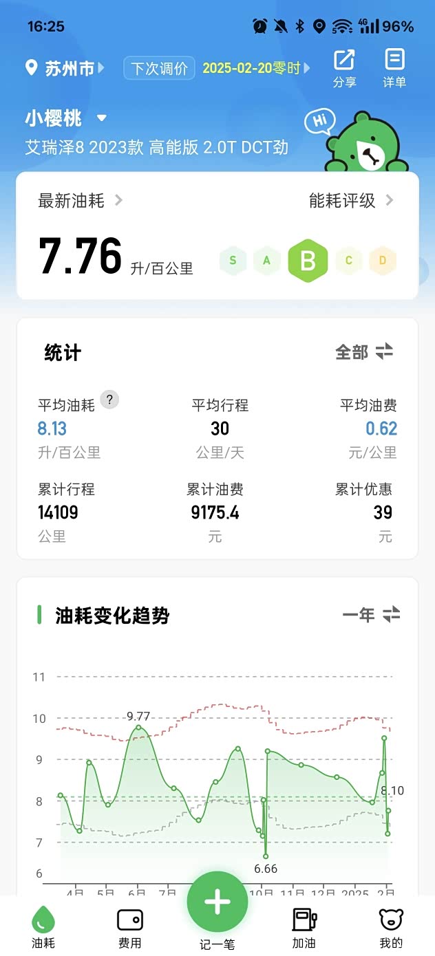 回顾这14000公里的驾驶历程,整体油耗为8.13升/百公里,累计加油费用为9100元,平均每公里6毛吧。这样的油耗表现不仅让我在日常使用中节省了不少燃油开支,也让我对这款车的综合性能更加认可。艾瑞泽8的动力输出平顺且充沛,无论是在市区拥堵路段还是高速巡航时,都能提供良好的驾驶体验。同时,它的底盘调校也相当扎实,过弯时车身稳定性很好,给驾驶者带来了足够的信心。