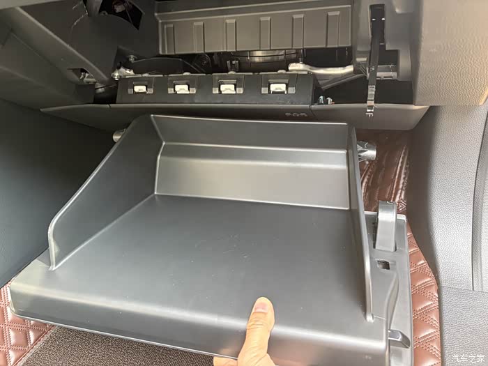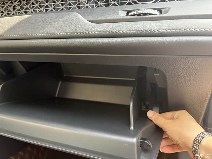 3.打开后,找到右边的挂勾,我小手所放之处。用力往下按,便能取下手套箱抽屉。