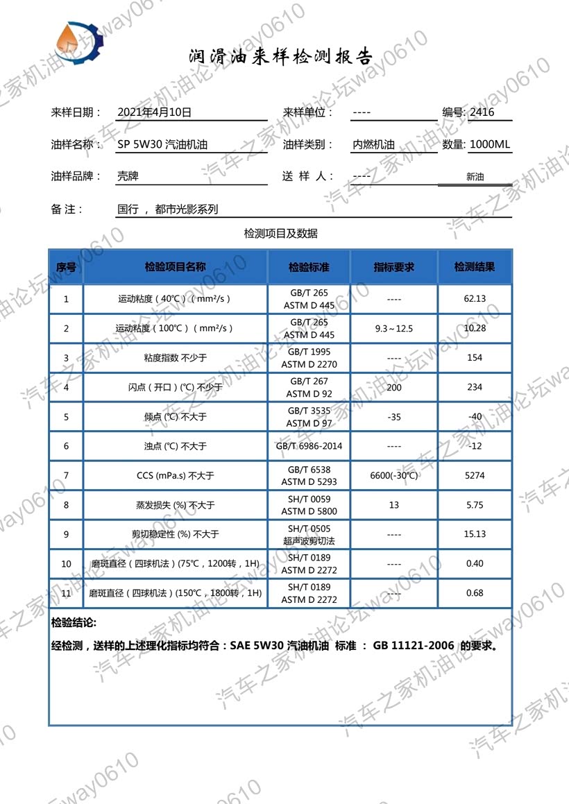 数据仅供参考,检测只对样品负责,样品由论坛车友提供,一升装未开封新油。