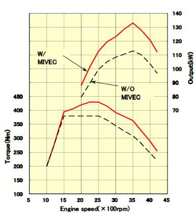 带可变气门正时及升程的4N15(红线)。根据三菱文件,得益于带可变气门正时及升程MIVEC,有两组不同的轮廓线的凸轮,分别应用于低转速和高转速。高功率版4N15才能够在达到传统扭矩高原后,切换到针对高速优化的凸轮,动力进一步提升。