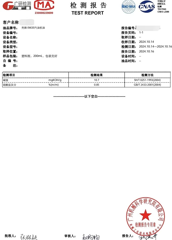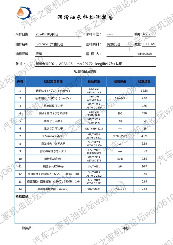 10.灰分,新0.85,这是重点,不符合C5≤0.8的要求,为了验证检测准确性,又将样品送检广研也是0.85,如下图,机油是车友在线下官方授权店铺买的,应该是这个批次品控的问题,老版本0.72没问题。