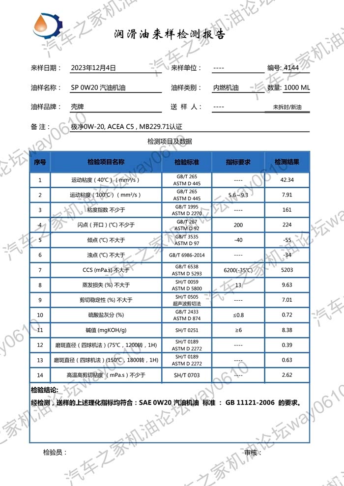 ,在机油送检第477篇,检测了奔驰229.71认证的国行金壳0W20,各项指标优秀,而现在最新版本升级为C6认证,车厂认证也增加了奔驰229.72和宝马LL-17FE+,车友再次送检,看看各项指标有没有变化,但出乎意料的是,这次送检的样品灰分超标,碱值也偏高,为了证实检测的准确性,又将样品送到广研检测复测了灰分和碱值,一起看一下!