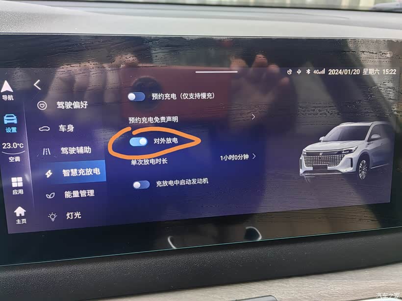 第二步,在中控大屏上依次点设置,智慧充放电。按照提示将对外放电按钮打开。