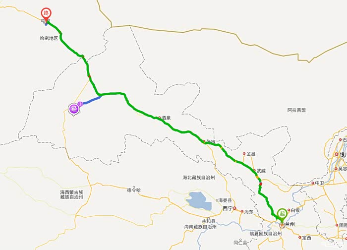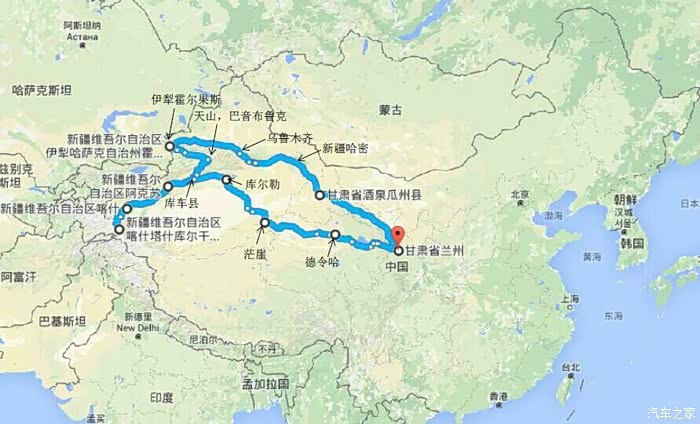 行程:兰州--瓜州县--敦煌市--哈密市--乌鲁木齐--塔城地区沙湾县-霍尔果斯市--伊宁市--巴音布鲁克镇--库车县--阿克苏市--喀什市--塔什库尔干塔吉克自治县--喀什市--库车县--轮台县塔里木胡杨林公园--库尔勒市--茫崖行政委员会(花土沟镇)--德令哈市--茶卡镇--兰州