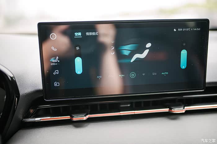 内饰设计最为瞩目的是其横向贯穿式出风口。通过强化颜色、材质与光泽的对比,从视觉上营造出更加宽阔的内饰空间感受。独创的装饰性叶片加上特有的金属拉丝纹理,营造出十足的科技感。
