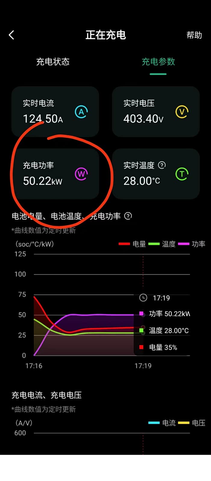 正好给大家测测充电速度,很满意,强回收状态下表显回收功率有54kw.这个插枪就有50kw的快充功率,这就是大电池带来的速度,