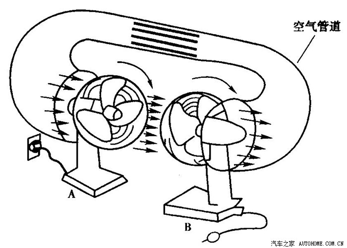 自动档最重要的部件是液体扭力离合器 ,先说明液体扭力离合器的传送原理(因为耗油都是这部分再损失动力),先以电风扇来解释。如下图: