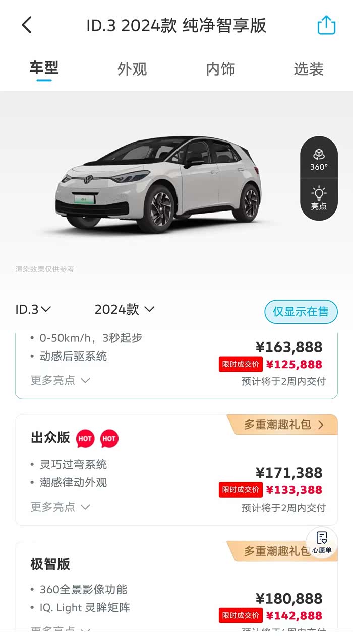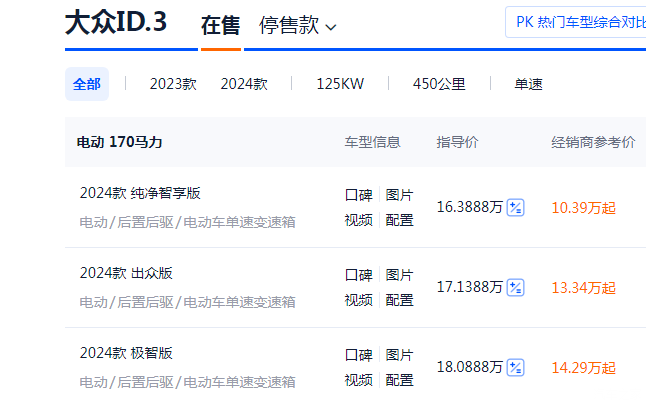 首先是价格,我们ID3在售的总共有三款,这三款官方优惠基本上全国都是统一的(3.8W),分别是纯净智享版(125800元)、出众版(133388元)、极致版(142888元)。但是我们从汽车之家官网可以看到,这个车终端的价格基本上还可以优惠。