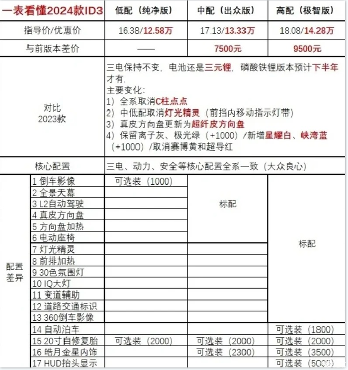 并且根据最新消息如果小伙伴有旧车想置换,那么根据新的政策还可以补贴1W元。所以现在ID3的价格还是非常香的,性价比很高。那三个版本我们应该怎么选呢?所以个人觉得低配的性价比是最好的。毕竟各位小伙伴买这个价位的小车以经济实惠最重要,贵的那些钱都可以充好久的电了,哈哈。不过中配的出众版对于那些觉得低配少了一些实用的功能,那么出众版还是挺适合的,毕竟也就过了几千元。当然如果特别喜欢矩阵式大灯的小伙伴们会选择极智版,喜欢一步到位的会直接入手高配。但是价格也上来了。最终喜欢哪个版本,那就看小伙伴们自己怎么选择了。(具体配置和相关价格见下图)