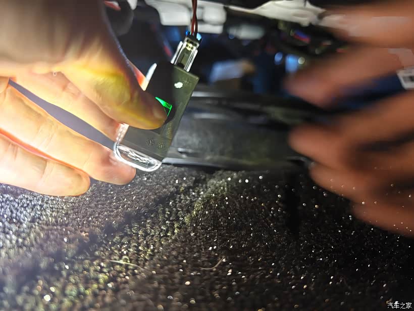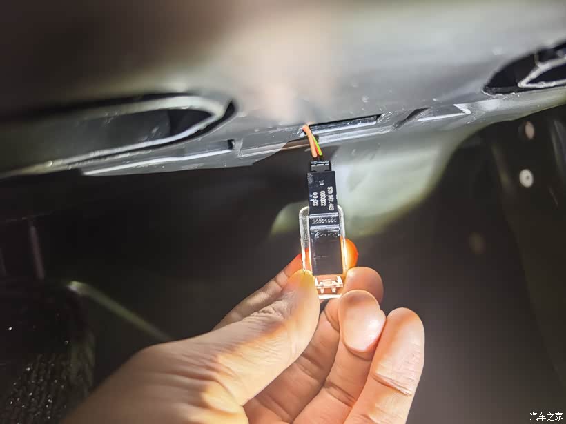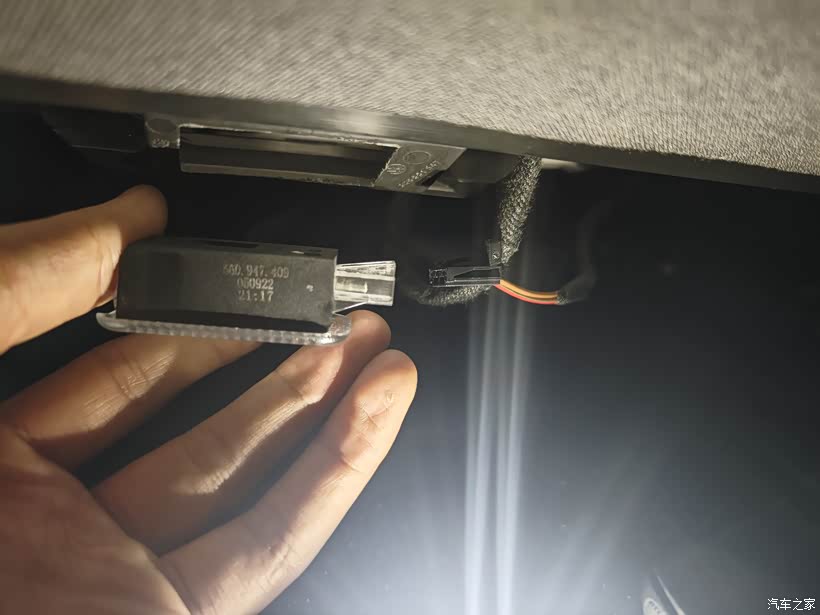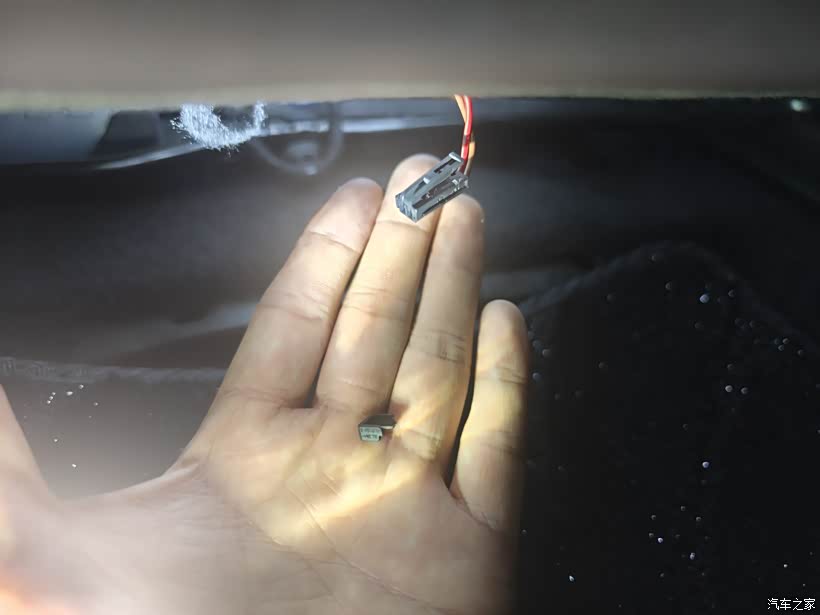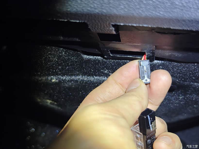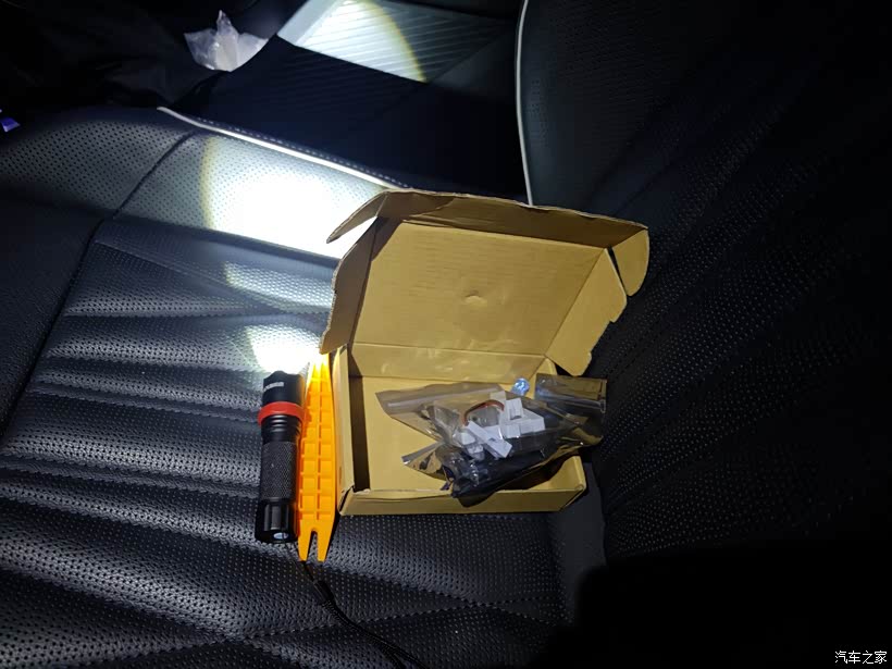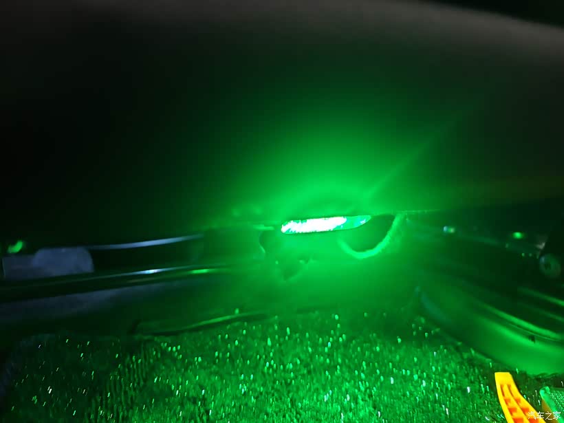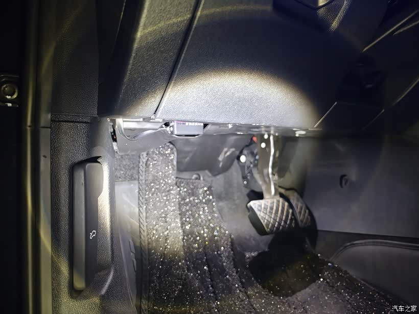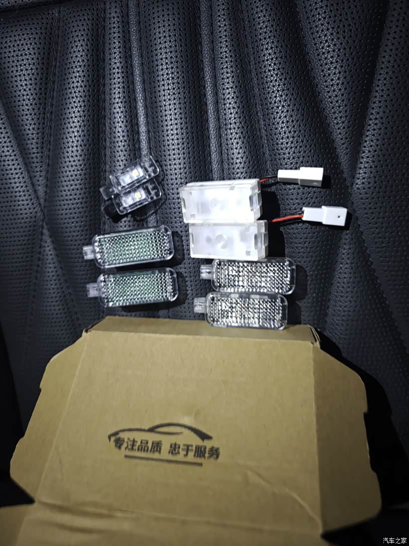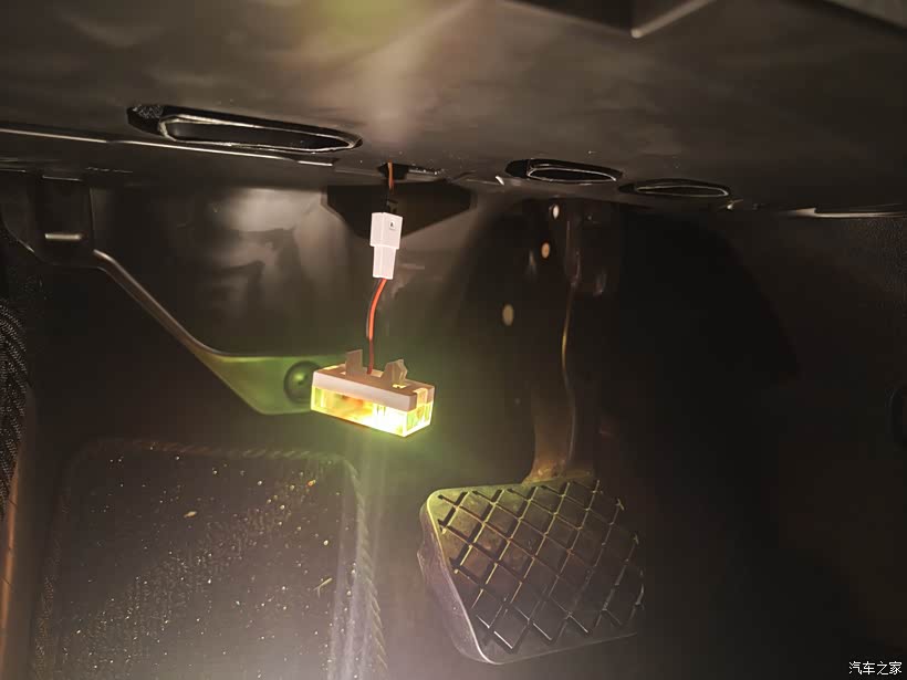 第二步:就是安装新的七彩脚窝灯,他的前排脚窝灯要比原厂的要更大一些,所以它会露出在外面,不能卡到原车孔,没有那么完美的无缝对接。