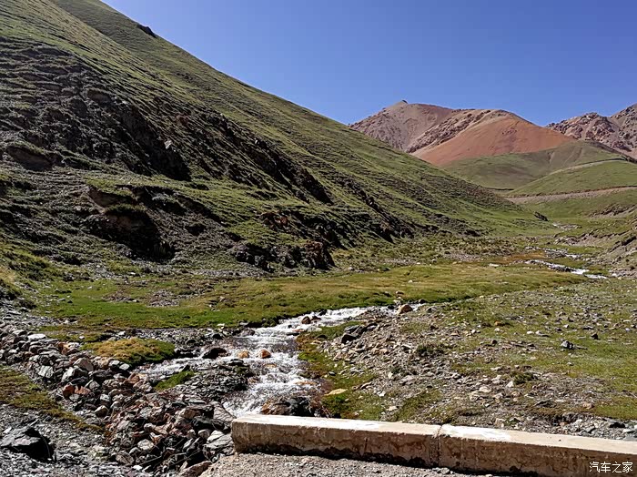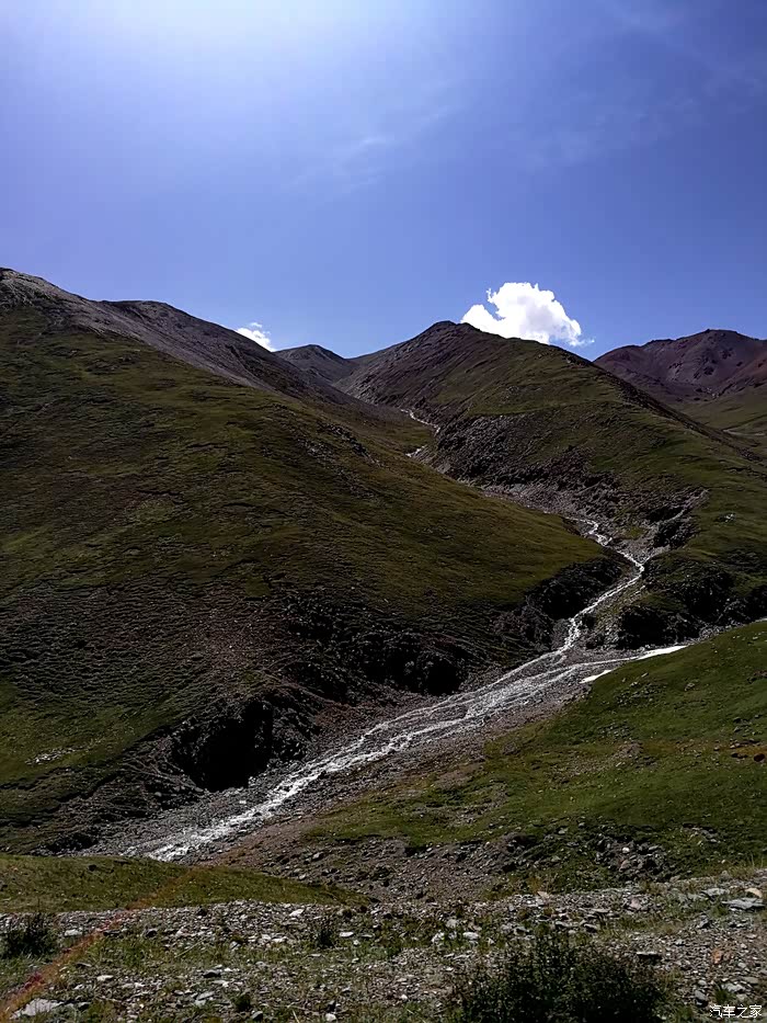 通过了这段塌陷,后面的道路基本上都是说的过去的砂石路,并且海拔逐步下降,有机会关注路旁的景色。山沟里大块的白色冰层,吸引了我们的目光,这与奥维地图上显示的相对应。虽然是高山,毕竟是夏日艳阳当空,冰层竟然还有残留,可见日夜温差之大。山道弯曲之间,山沟里的涓涓细流,如银线一般蜿蜒而下,不断地汇聚、再汇聚,到路边时已经组合成奔腾的溪流,在阳光下散发着耀眼的白光。这里的溪流已经不是朱龙关河的源头,而是汇聚到一会就看到的托莱河。