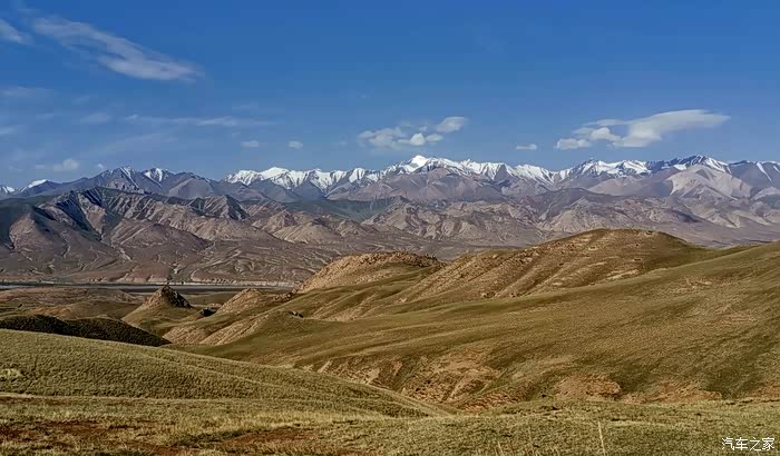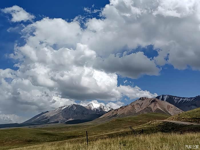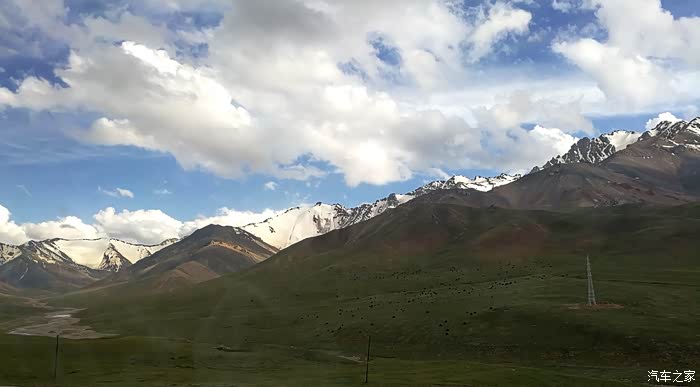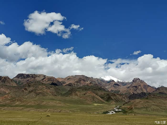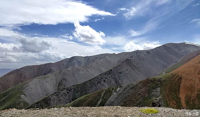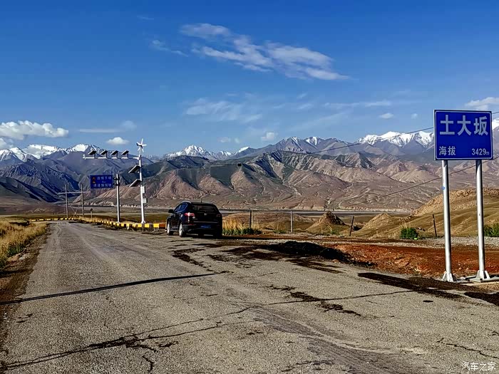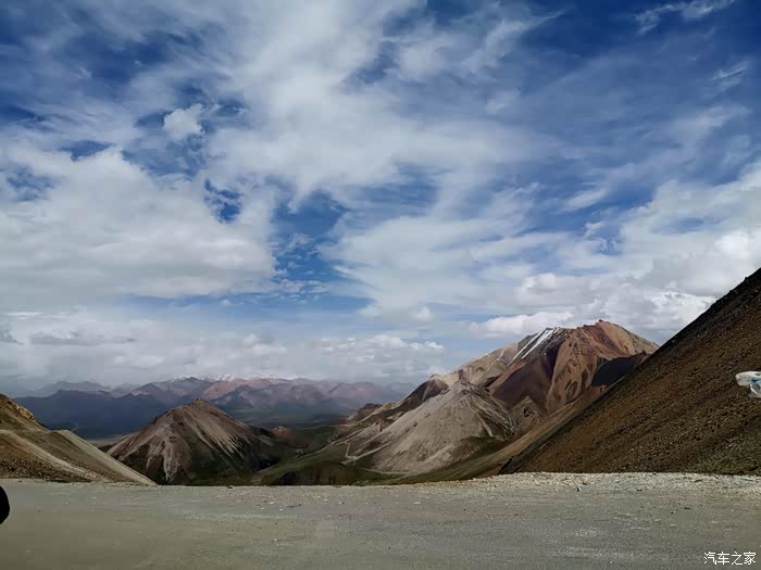 穿过白杨河东沟山口,进入大东沟滩,路况渐差,两侧山体裸露的红砂岩比较多,色彩一般化,勾不起拍摄欲望,但山头植被稀少,由领导记录一张。然后逐渐爬坡,快到达板时,已经能够看到远处的雪山。9:04到达土达坂(62km),海拔3429米,这时已经是满眼高原景象,远处的山脉绵延不绝,一排排雪山构成了天际线。停车拍照的同时,测量工作也在进行,氧饱和度都已经降到了90,我的血压只能看到150mmHg,赶紧加上缬沙坦(早晨吃的络活喜)。