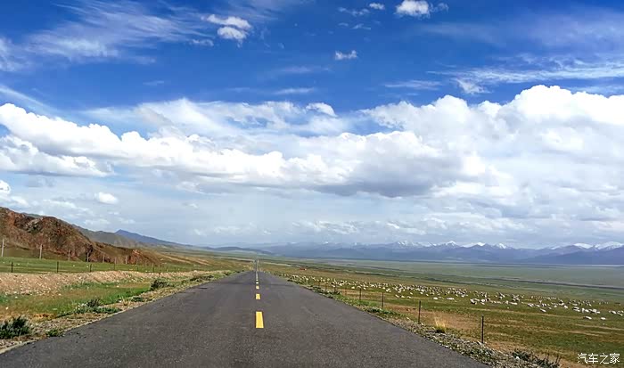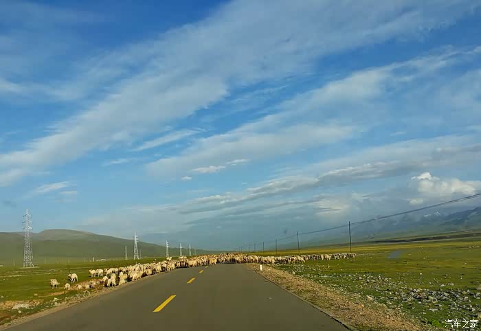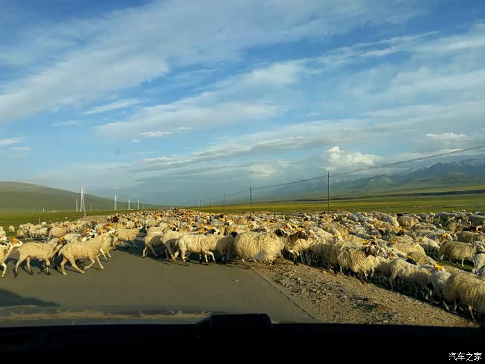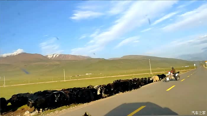 这一段道路好像修整过了,虽然还是存在大波浪的路面,但比2017年的状态有所改善,车速超过60还是明显感到颠簸。傍晚回归的羊群成了道路上的减速器,耐心的等待中看着羊群的骚动,忽左忽右、争先恐后地向道路两侧躲去。现在牧民标记羊群的方法有了进步,标记在羊角上,避免羊毛上的大面积色块影响羊毛质量,感官性状也改善不少。不远处又遇到了牦牛群,牧民骑着摩托把它们赶到左侧路下面,避免牦牛乱窜。