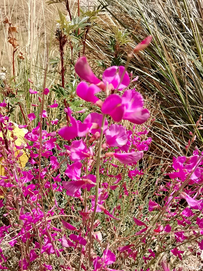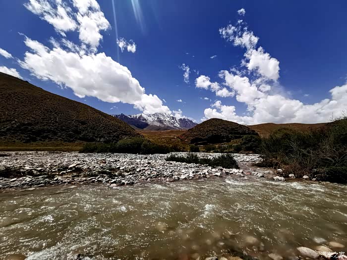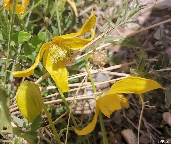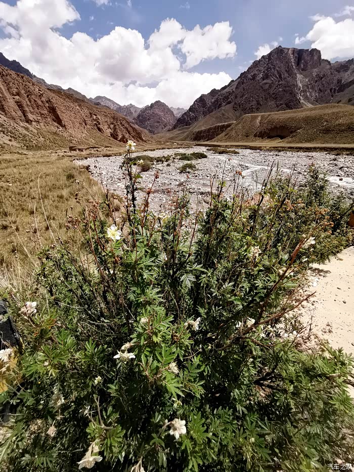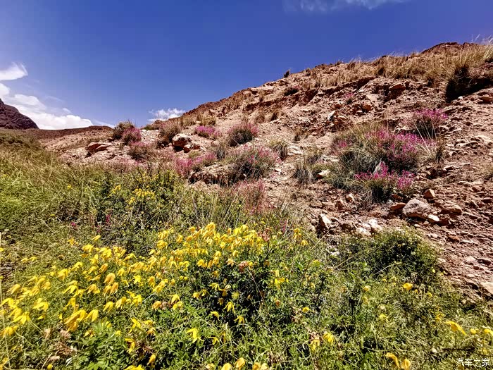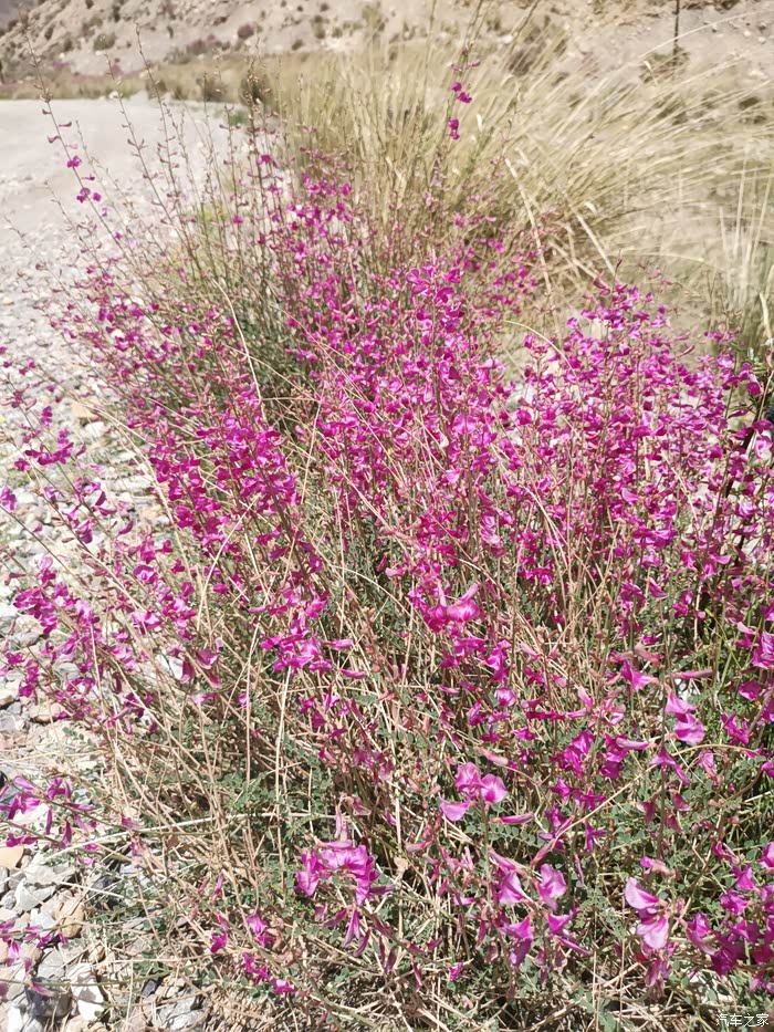 此刻内地应当是正午不到,虽然烈日当空,微风徐徐,河边丝毫不觉得酷热难当,也丝毫没有气喘头痛。这应当得益于河谷中,茂密的灌木植被。7月是水量最为丰沛的季节,也是河谷植物生长的黄金时段。不仅河滩上的甘青铁线莲盛开出一丛丛金黄色的花朵,而且路边的坡地上,紫红色的花朵一丛丛向高处延伸。这种紫色植物,是进入s215见到最多的,间或出现在路旁,或者山谷中,在前面山谷河滩地的大片色彩,估计也是她的杰作。图鉴上称为西南木蓝,属于蝶形花科。