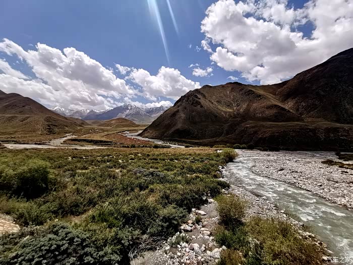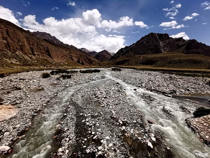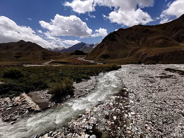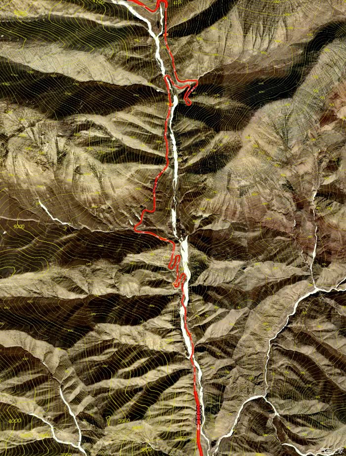 照片上看,水流宽幅类似于小溪,但是水流甚急,哗哗作响,那是落差较大的缘故。从高程叠加地图上看,桥所在的海拔3100米,东面山谷不远处就是3150米。低矮的云层,在山谷中投下了巨大的阴影,右侧的山谷中有一片河滩地,碎石堆上蓬勃地生长着大片绿色植物,远处还有成片的紫红色花朵,成为高原荒漠中的靓丽色彩。