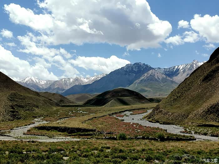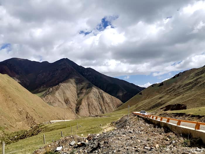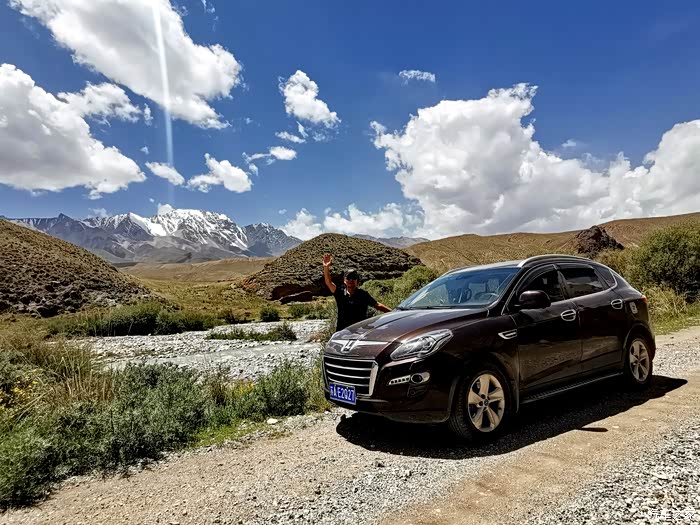 在三叉路口左拐以后,已经离开了山区,沿着平行托来河的道路行驶,沿途也看到了放牧的羊群。接近s215的末段,对面开来一辆白色丰田,***到路边等她通过,看车牌是宁夏银川的。会车时,丰田停下来,女司机问路:这是什么路,通到哪里?我说,你们怎么开过来的。她说,看着一路风景漂亮,就拐进来了。再一看,四个女汉子,胆子真大,建议她们掉头,已经五点钟了,这时候翻越高海拔垭口风险太大,何况毫无准备的女同胞!