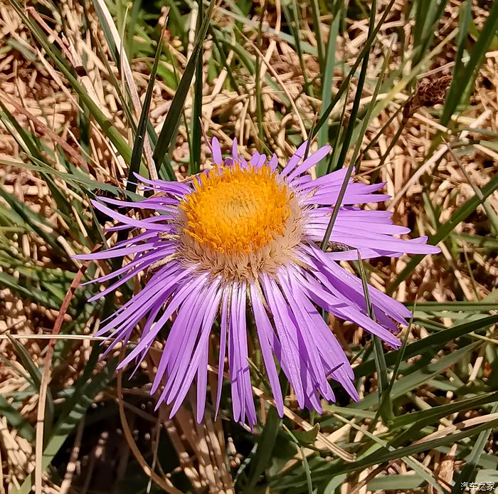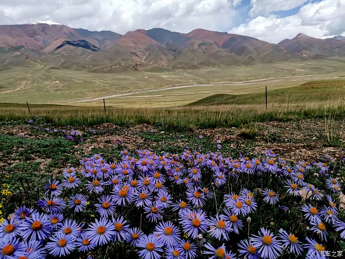 中途停车拍了几张照片,都是路边的花丛吸引力太大。前面也见过这样的菊类植物,但都没有这山坡上的面积大,绵延几十米长,宽宥十五米左右。有一丛非常密集,云层遮蔽阳光后,色彩也是极为自然,在远处群山映衬下异常艳丽。当然蹲下拍照也是气喘吁吁。图鉴上类似的名称有两种,一是星舌紫苑,生长在3200-3500米;二是缘毛紫苑,生长在2700-4600米。我想它应当是后者——缘毛紫苑,也叫翠菊。