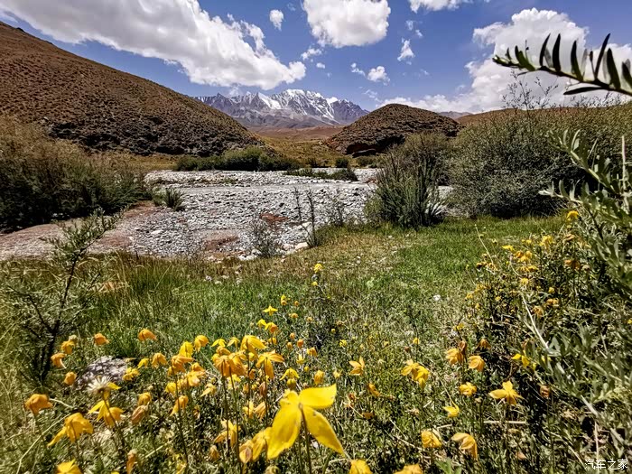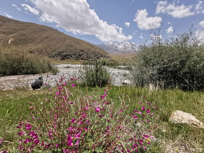 沿着河谷继续行驶4km左右,左侧砂岩垂直状,明显的人工开凿痕迹,右侧山势逐渐陡峭,视野集中到山谷道路之间。转弯间,远处的雪山在起伏的山峦中露出清晰的容貌,湍急的河水引人注目,河滩上的花草令人流连。此时为一点半,事后查找地图,名叫大拉排,海拔接近3200米。