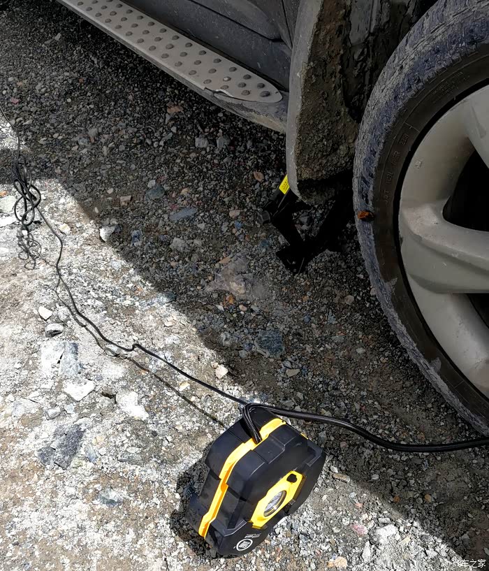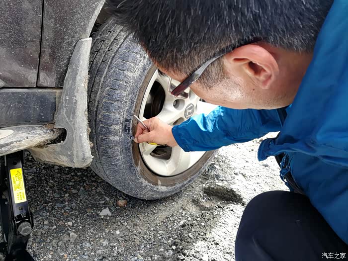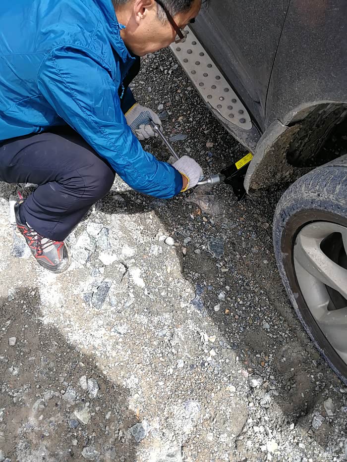 打开后备箱,拿出千斤顶、气泵、补胎工具,LD很诧异:你这板子下面放了这么多东西!好在停在山口路旁,路面下的基石都很扎实,摇把敲击车底横杠,确认位置后,便开始摇动手柄。虽然是第一次使用,但操作步骤并无错误,每次只能旋转三分之一圈,慢慢来吧。对于我们这种单车出行的情况,在高原山巅遇到爆胎,心态要平稳,动作要轻缓,解决问题是第一要务。