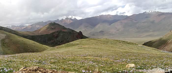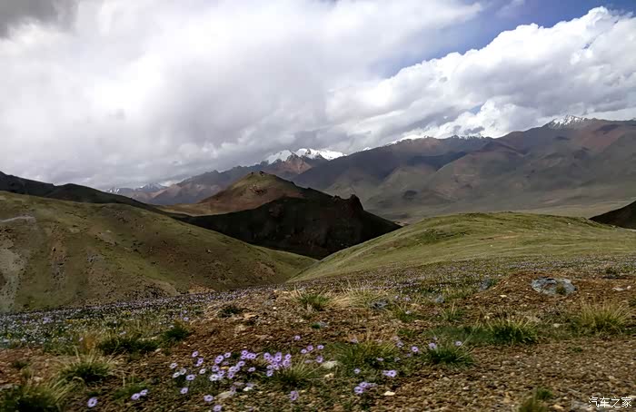 随着道路的弯曲,海拔逐步上升,路况越来越差,路上的落石渐多,坑洞陆续出现,部分道路只能单车通行。此时再也不敢东张西望地看风景了,只好叫LD拍拍照片,途中的照片大都是剪辑修改的。几个弯道之后,原先横亘在眼前的高大山峰,已经在我们目光的平视范围啦!在平缓的山坡上,大片的缘毛紫苑蓬勃盛开,只是在高原阳光下,色彩黯淡了一点。