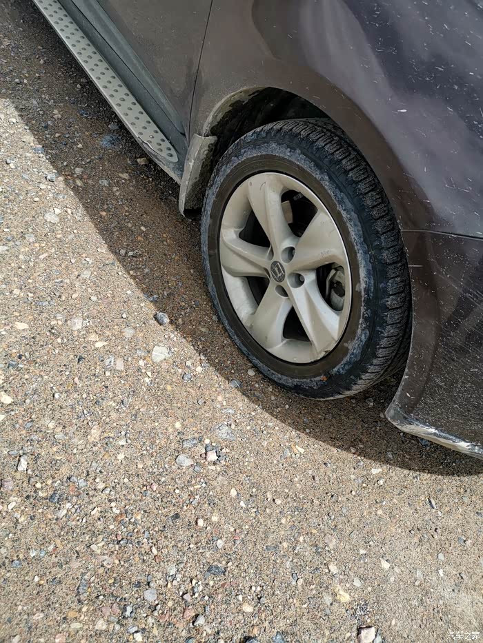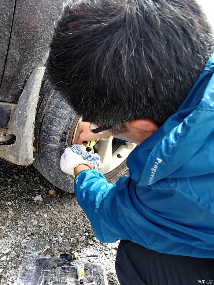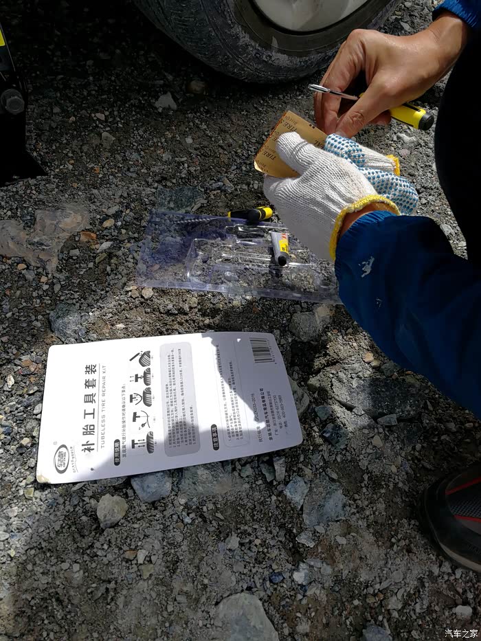 好在一早就吃了降压药,中途又追加了两种,在四千多米的高山上,做体力劳动没有丝毫气喘、心悸。用了十多分钟,把车子抬起来,尝试了一下拧螺丝,毫无动静。随即用摇把敲击轮胎,把附着的泥浆震动下来,一眼看到了翘起的破损处,最深处的漏气孔很小。看来是侧壁被锋利的落石刮伤了,导致缓慢漏气,由于车速不快、山路颠簸,没有感觉到胎压下降,一停车静态下彻底瘪掉了。