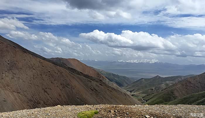 大概行驶了两公里,到了二只哈拉垭口,停车再看。途中经过一个水坑,补胎处正在冒气泡,压力不够啊!再次气泵补气,终于打到1.2个气压,补胎处不冒泡了。此时15:58了,山风渐大,皮肤衣已经抵不住温度的下降,已经能够看到青海的祁连山了,后面还有五十多公里才能抵达央隆乡。好在最危险的路段基本过去,控制车速,防止车胎继续损坏就可以了。