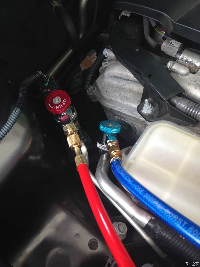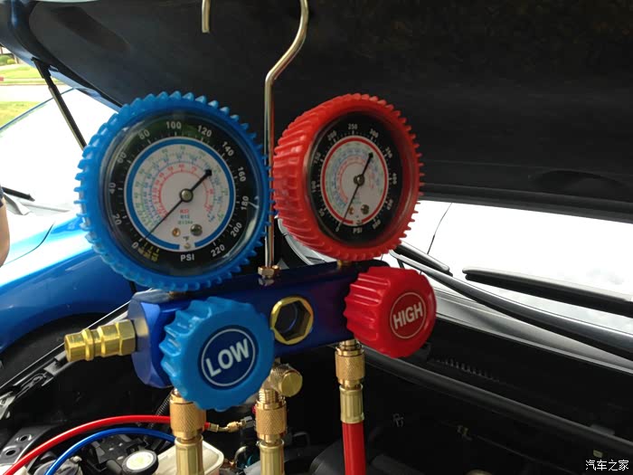 我这检修流程是,在空调系统的高压H和低压L端都接上空调压力表,压力表再接真空泵,之后打开所有阀门,给系统抽空,因为我这已经基本漏掉了,系统内没多少残留。如果你的车子还剩很多,应该找修理店去给抽出回收。 抽真空之后,应该是关闭高压端,打着车子,打开空调制冷,从低压端连接R134a罐子,按照规定计量,加入制冷剂。 并且观察系统压力和出风口温度,在压力和温度合适时,停止补充。