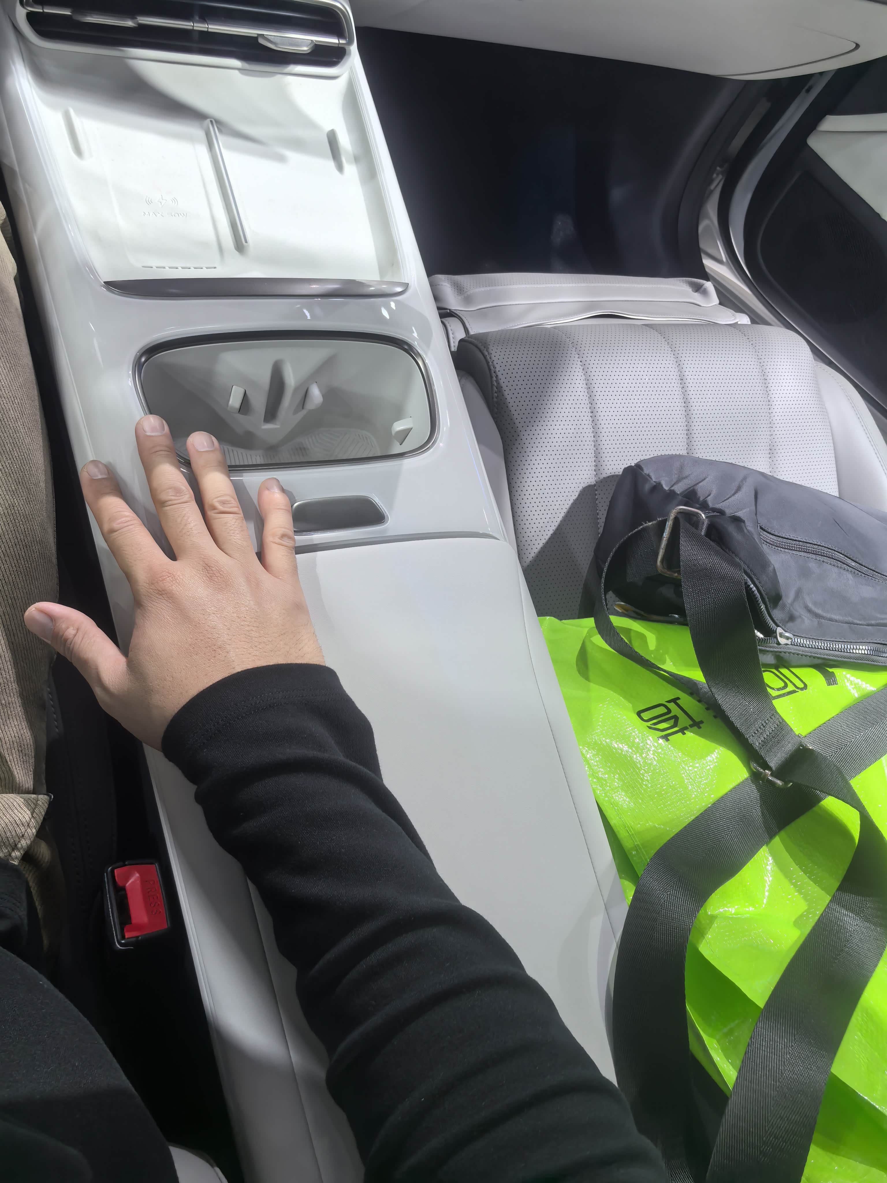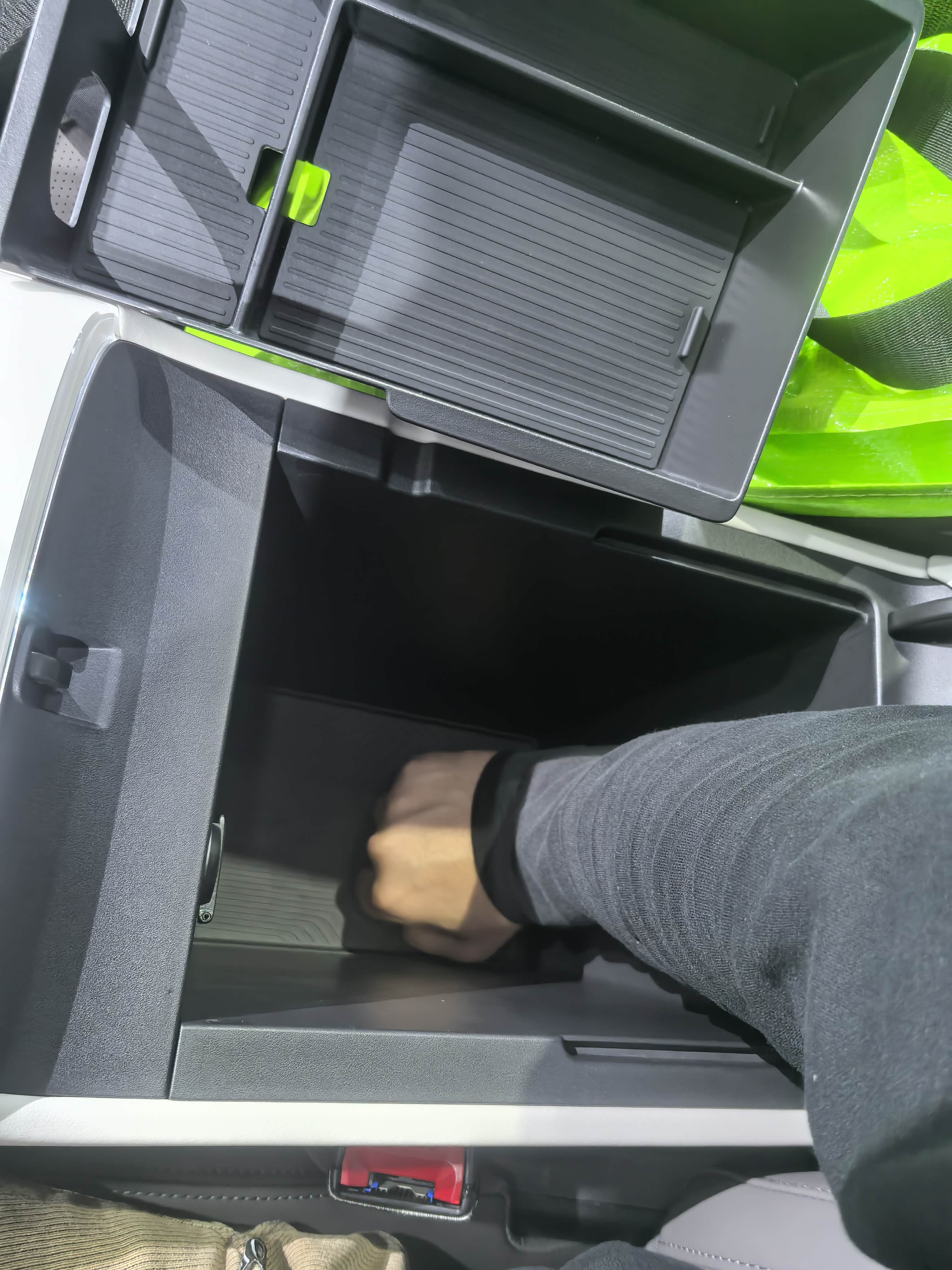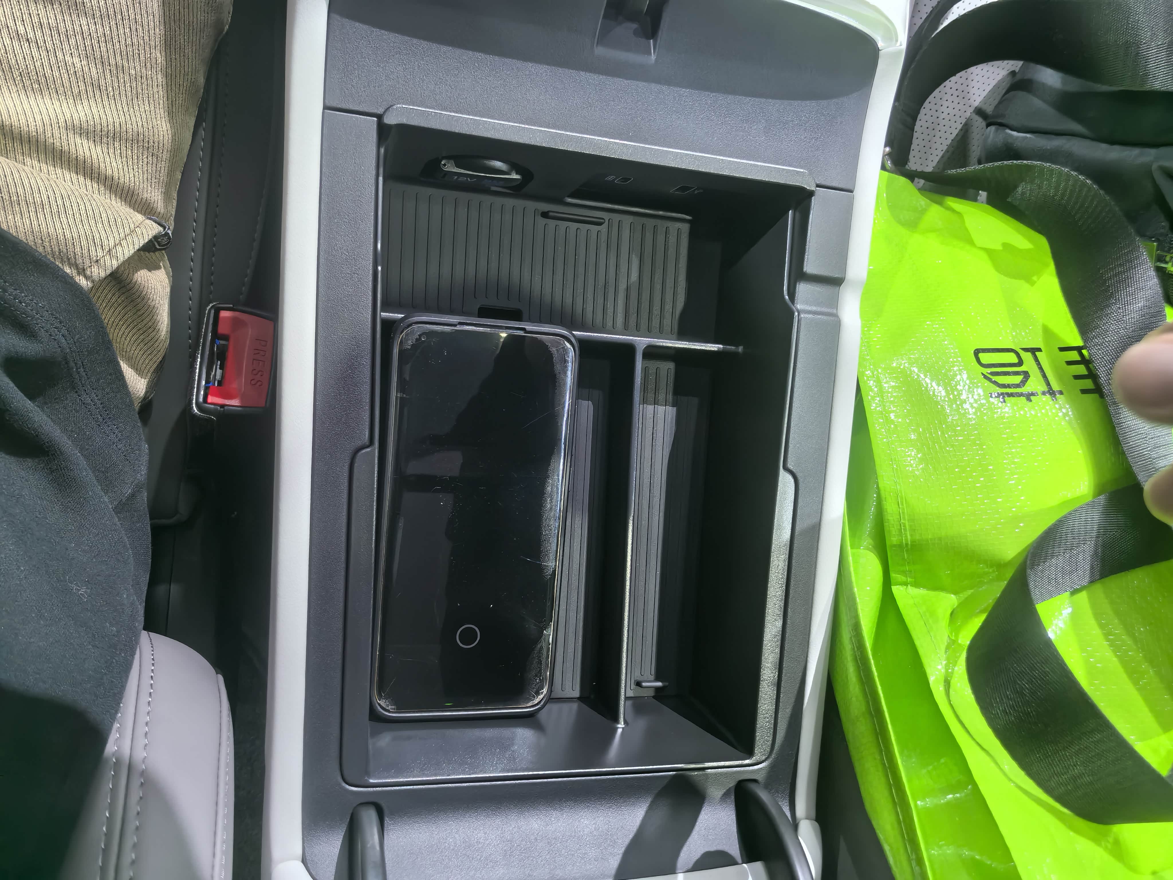 ③中控台的储物柜分上下两层,上面那层做了多个凹陷处理,可以放多些东西,只是里面那个长方形凹陷位置设计的不够长,小米10S放不进去,这里考虑的不够周全。