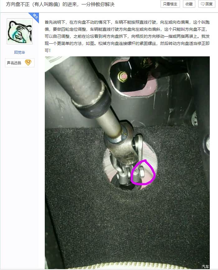 我的车直线行车方向盘偏左(偏一点点),按照你的图片(熄火)松开螺丝,把方向盘转到正确位置,再上紧螺丝,一次成功。