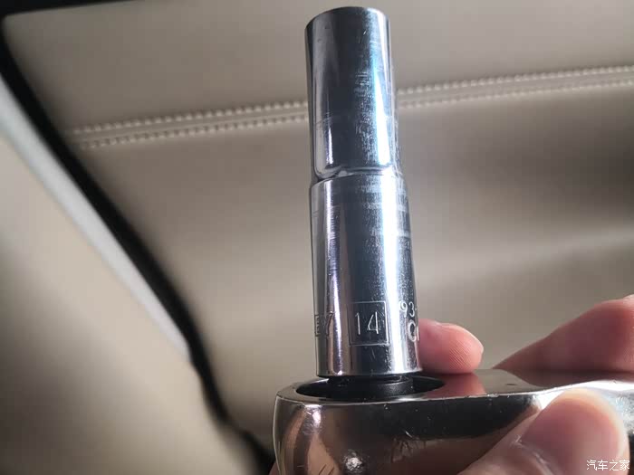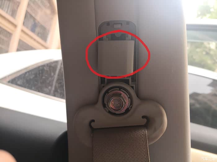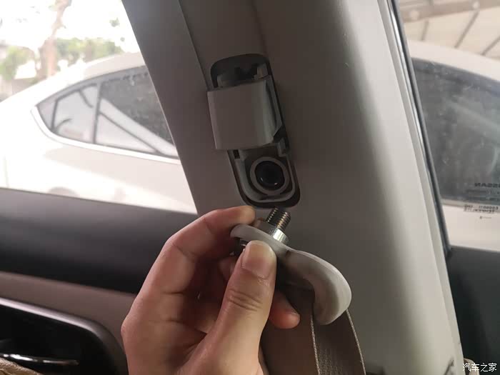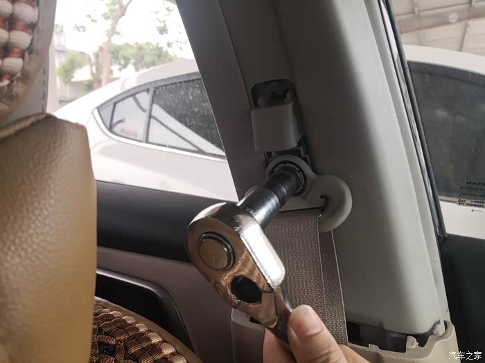 然后,抠掉调安全带上下位置的这个滑键的外壳(那个按钮不用管它),看到一颗外六角螺丝,这里要用14#的套筒头配合棘轮板手松开拆掉这个螺丝(开口扳手或者活动扳手不行,位置尴尬不好使力,容易把螺丝头弄滑牙了),连带这个安全带的卡扣就一起拆下来了(我拆的时候没注意这个卡扣,拆完上饰板卡扣后发现拿不下来,被安全带这个扣给卡住了)。