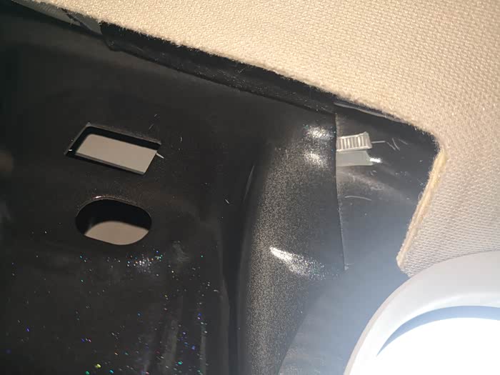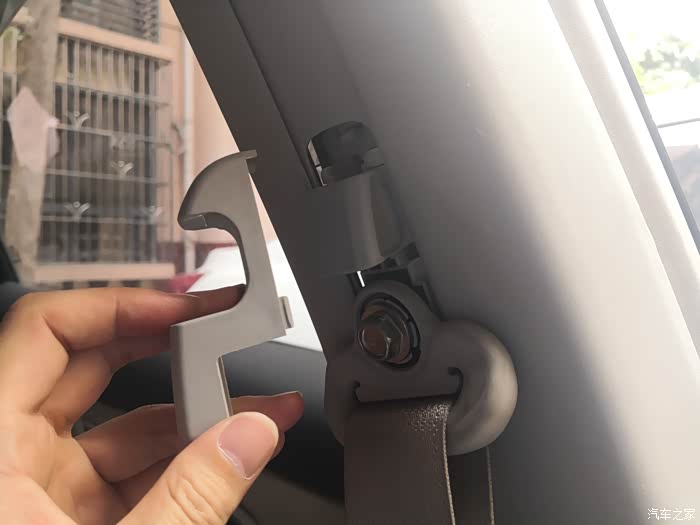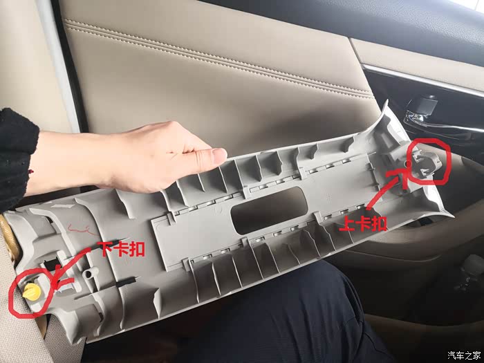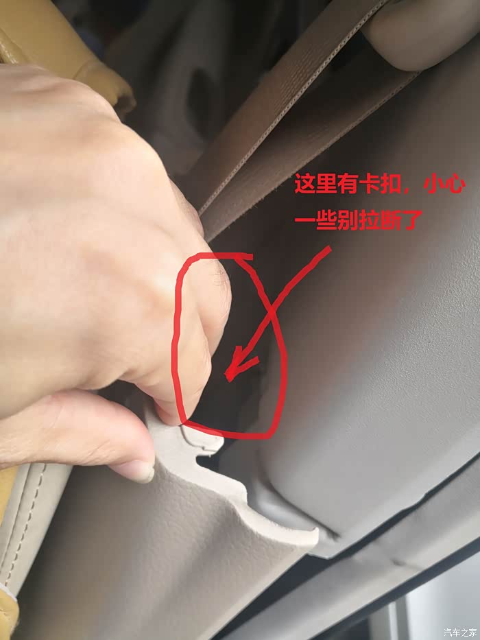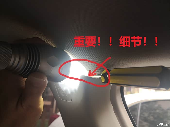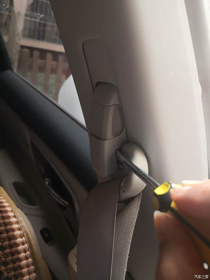 最后就是拆B柱上饰板了,先从底下抠住往外拉,松开底部的扣子。上边的扣子就比较难拆了,论坛里另一个暴力拆的贴子没仔细说怎么拆,只说需要技巧。最终研究了一下,这个技巧就是从上边用手尽量抠住饰板的缝隙,用手电筒照看卡扣在哪里,然后用个一字起子压住那个扣子再往外拉,就能把上饰板拆出来了。