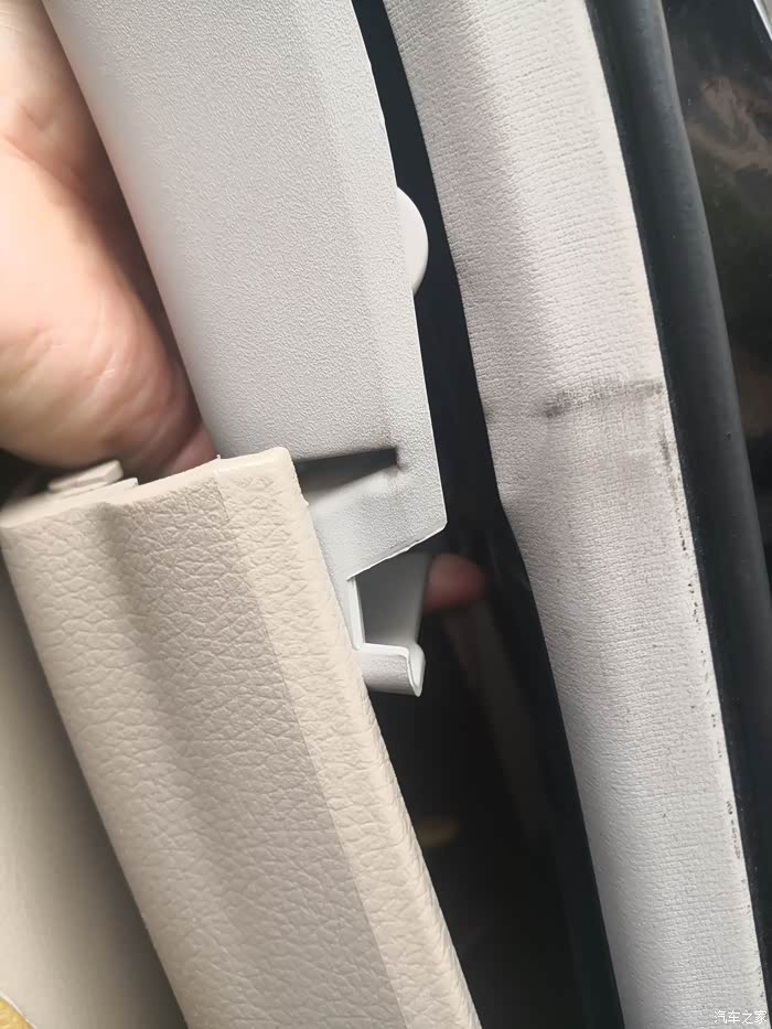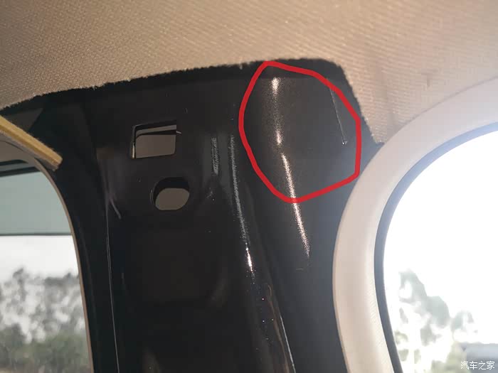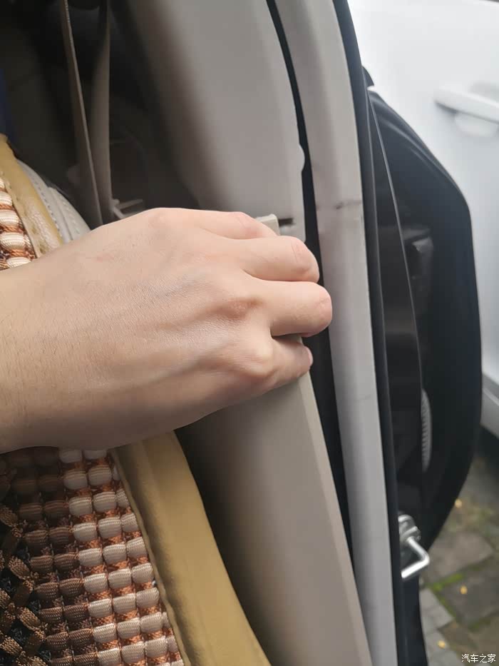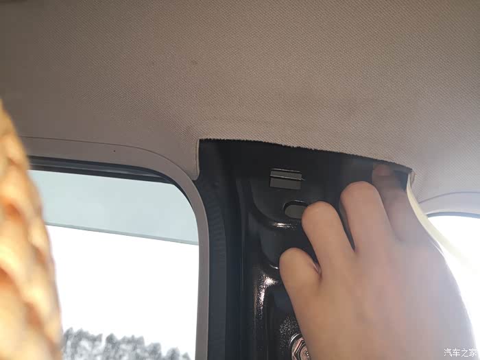 好了,饰板拆完后,下面就是确定是哪里异响从而解决了。启动车辆走一小段路,B柱内饰拆掉了还是有“嗒嗒嗒”的响声,证明不是内饰松紧的问题,当用手压住顶部钣金的时候,异响没有了,确定就是钣金的问题(其实听到的声音也就是B柱顶部的位置传出来的,加上车友们都说是钣金脱焊造成的,猜也猜得八九不离十了)。