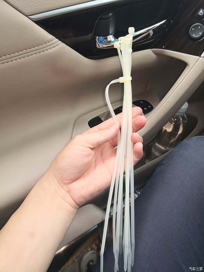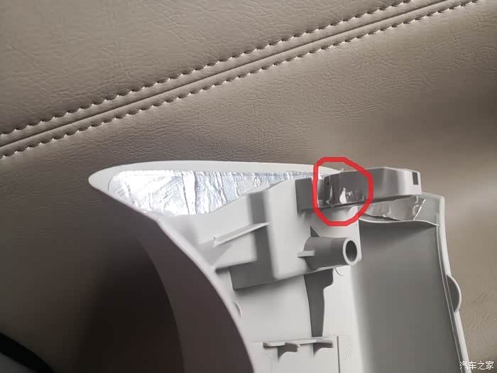 这个顶部的钣金是有个接缝的位置,手压这块金属其实它是一动不动的,可能就是开车颠簸的时候才会有非常轻微的振幅,造成异响。听车友们说4S是拿锤子敲钣金的,我担心自己敲的时候安全气囊会爆,安全起见,就拿东西塞缝隙好了:简单的处理方式-用扎带伸进缝隙卡紧。