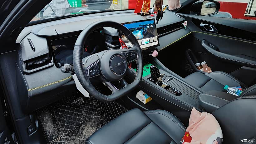 方向盘的款式也是非常的远动,手感也非常的不错,中控显示屏很大,也很智能。车辆设置里有很多功能,有四种驾驶模式可以切换,大灯,后视镜,天窗,空调,座椅调节等等,都可以在车机里面设置,座窗体验里可以调节氛围灯和音响。屏幕可以上下滑动,真是太酷了。