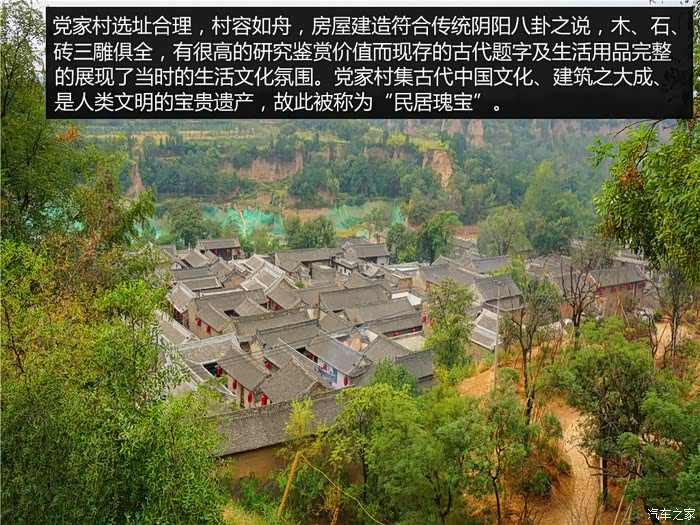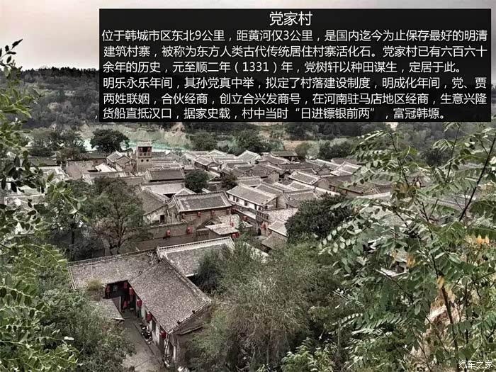 党家村的历史是民居建筑与文化、伦理、民俗、信仰交相辉映的发展史。党家村的古民居建筑群,始建于元至顺二年(1331年),至今680多年历史,是全国重点文物保护单位,中国历史文化名村。党家村地处陕西省韩城市东北方,东临黄河,南绕泌水,避风向阳,村低寨高,村寨相连,瓦屋千宇,不染尘埃,文化内涵极为丰富。被誉为“东方人类古代传统居住村寨的活化石”。