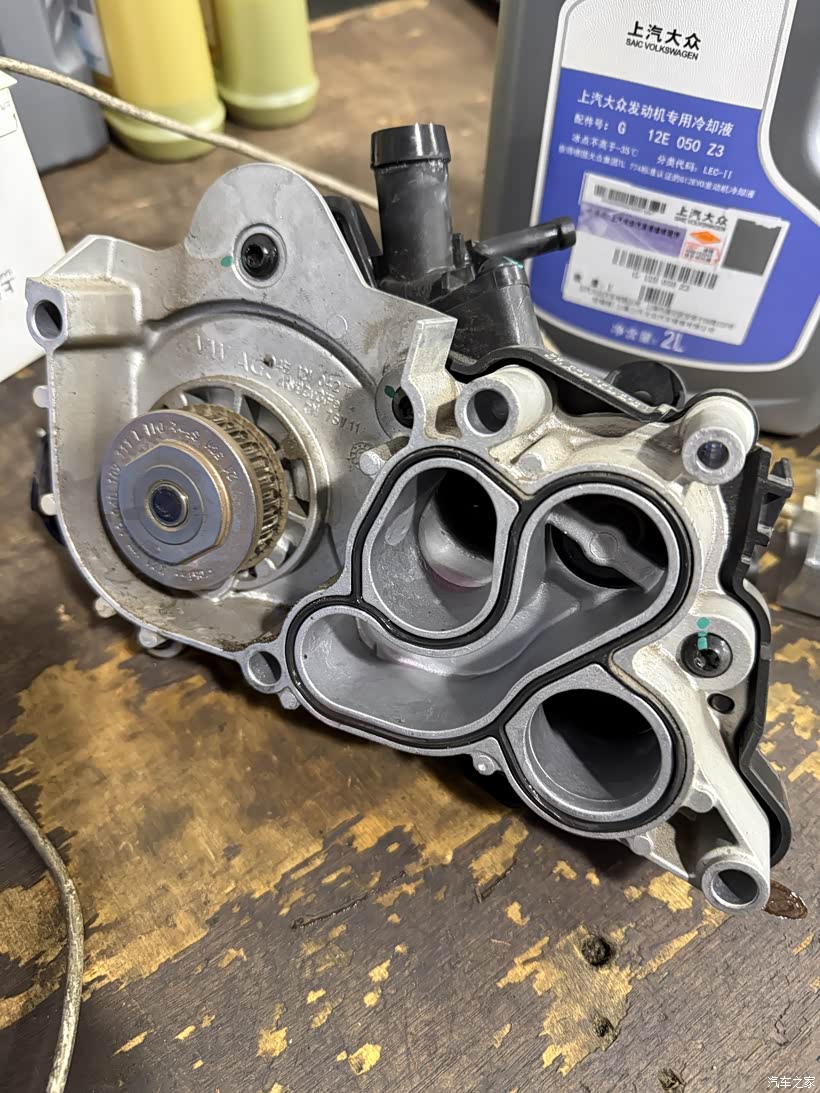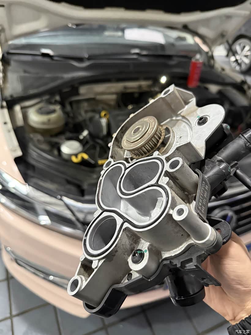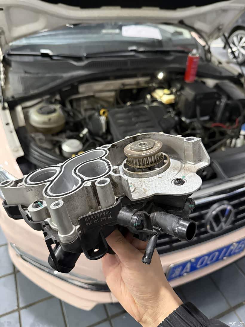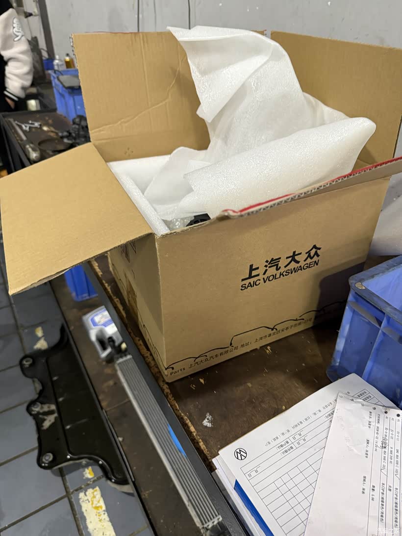 由于是申请的延保期内索赔,4S就没有给我单独换节温器,直接换的节温器水泵总成,配件需要等厂家发过来,经过10多天的等待,我抽空周末来更换节温器,看到一个印有上汽大众的包装箱放在我车旁边,里面应该就是从厂家发过来的全新节温器水泵总成。
