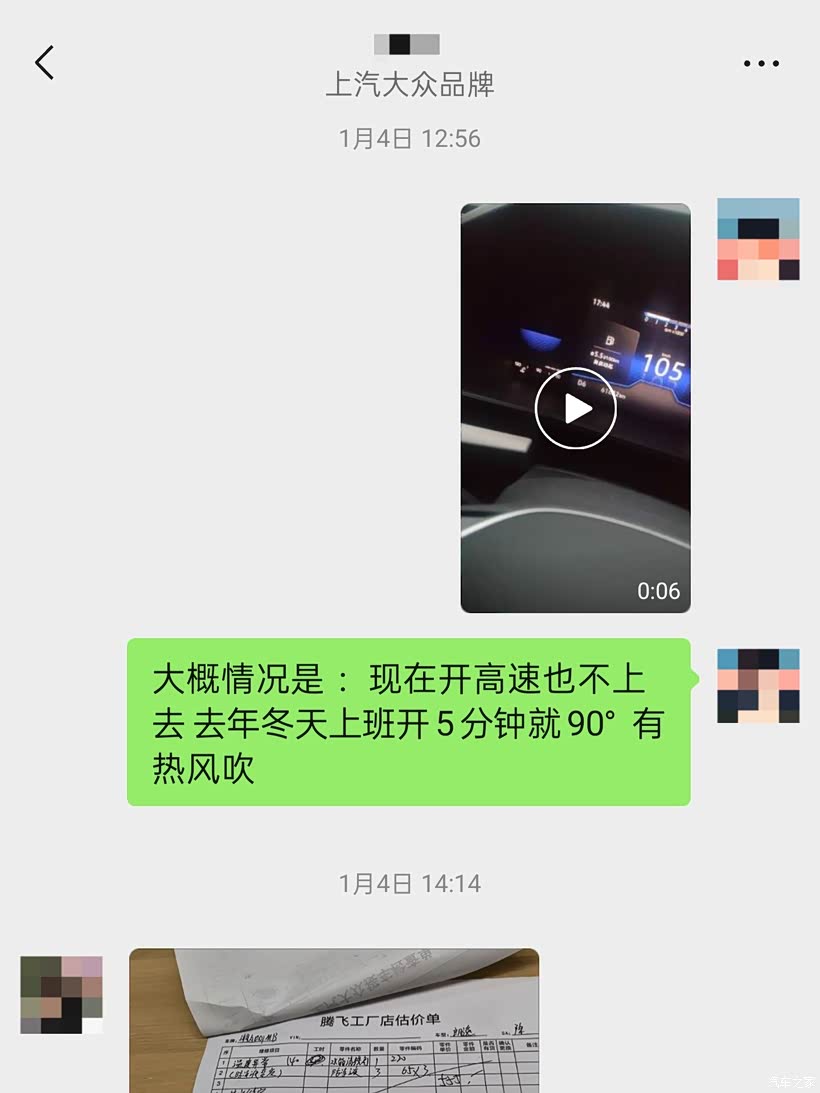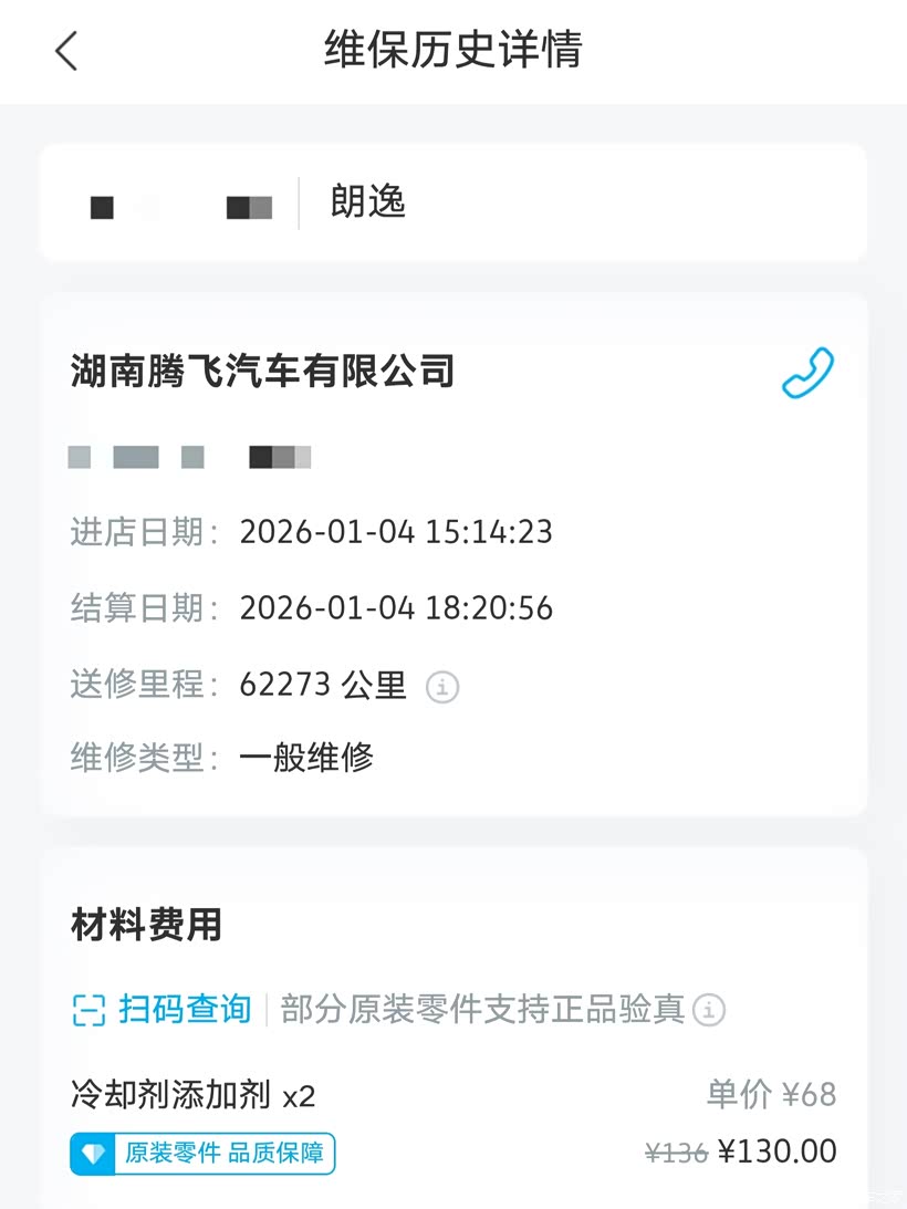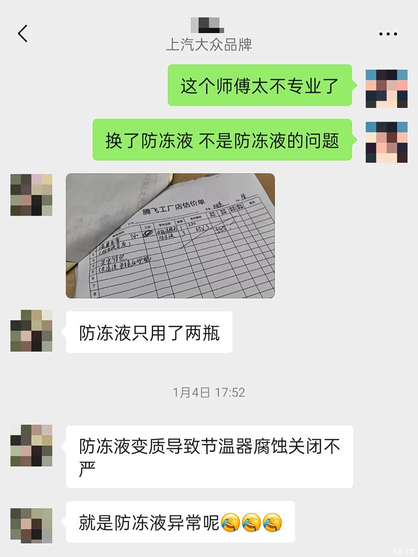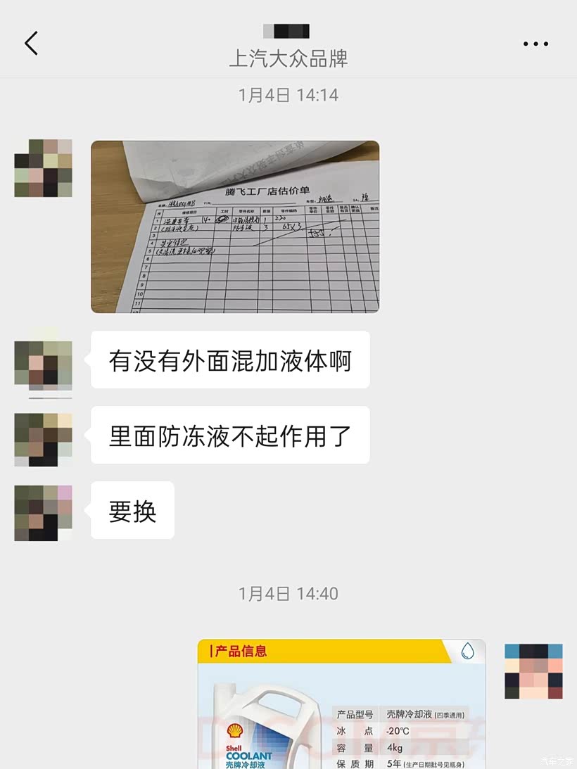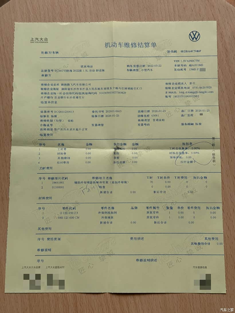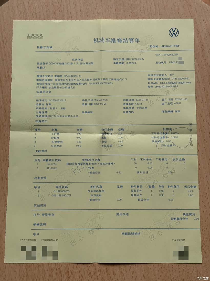 因为车子还处在延保期,原车质保3年10万公里,购买延保后可以再延长3年8万公里,所以我就直接开到就近的长沙市上汽大众腾飞4S店进行延保索赔,开了个单子说是我车混加导致防冻液失效,需要更换防冻液并清洗水箱,从这里我就有点疑惑了,我车是在2025年5月份才更换的4L壳牌-25度防冻液,我心想如果是这个问题那车子就不必拆修更换节温器了呀,本着原装不动最妥当的心态,结果在更换完防冻液并清洗水箱后,车辆水温上不、暖风不热的问题完全没有得到解决,这里我就对4S店的专业性表示质疑,表示换了防冻液后才说是节温器的问题,我就找修理师和服务专员讨要说法,给到的回复是:“说需要更换完防冻液后才能排查出是节温器的问题,说就是防冻液变质导致节温器腐蚀关闭不严,说帮我申请索赔可以免费更换节温器,只要付这次500元的防冻液和清洗水箱费用就行了”。