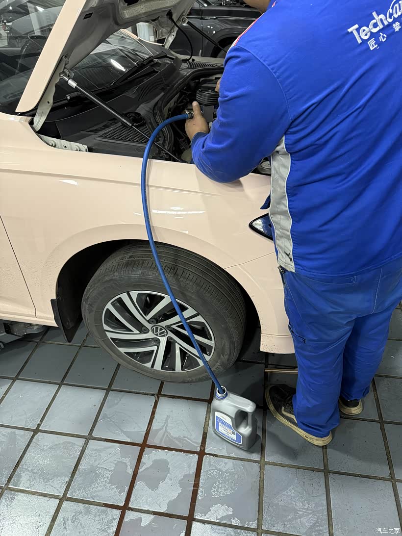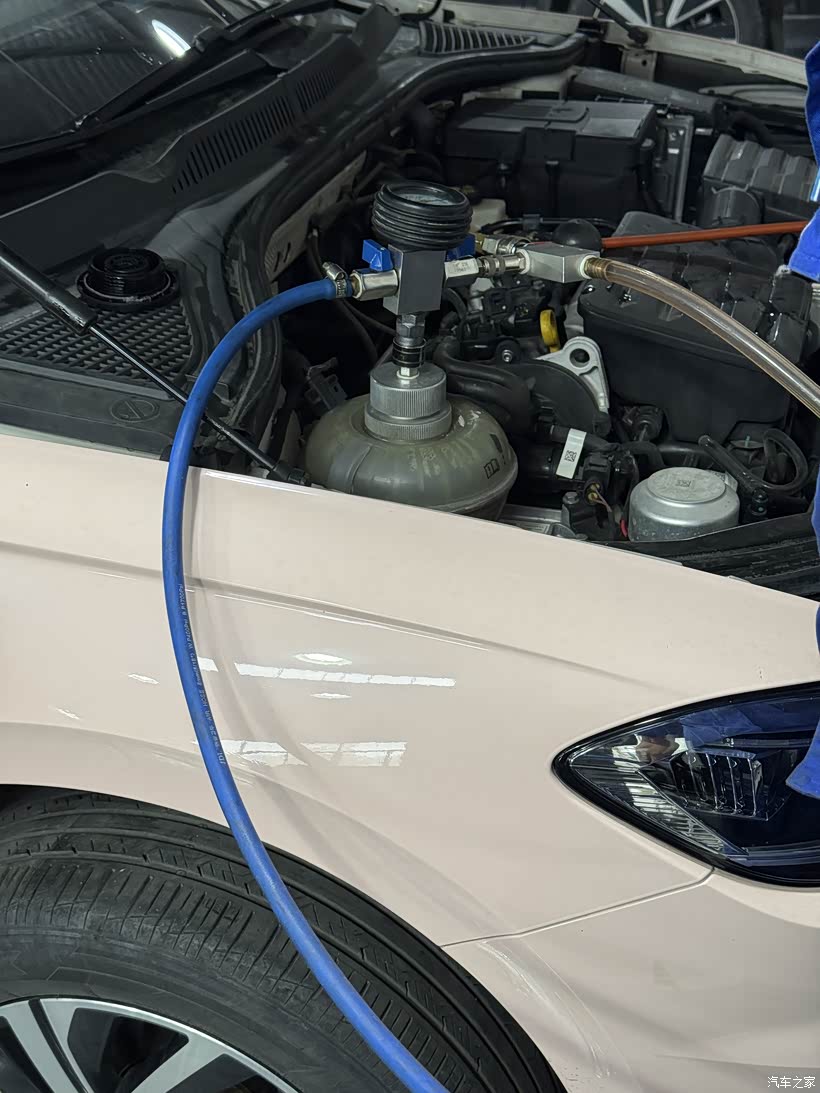 最后一步就是添加足够的防冻液,师傅拧掉防冻液水壶盖子,将一个压力阀拧在防冻液水壶上,链接上高压气管,通过加压循环的方式,进行加注新的防冻液,用了差不多2L多的防冻液,才把防冻液加足,我看了防冻液容量正好在了水壶的最大上限刻度尺,然后师傅启动发动机原地怠速看下有无漏液,并观察水温是否正常升温,一切正常后就按空气滤芯好盒、进气格栅盒、发动机护板都安装好,进行最后一步路试,经过十来分钟的上路测试一切正常,完美交付。