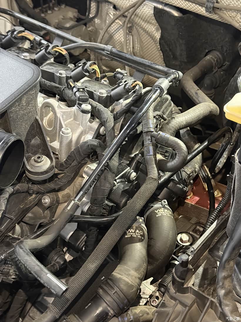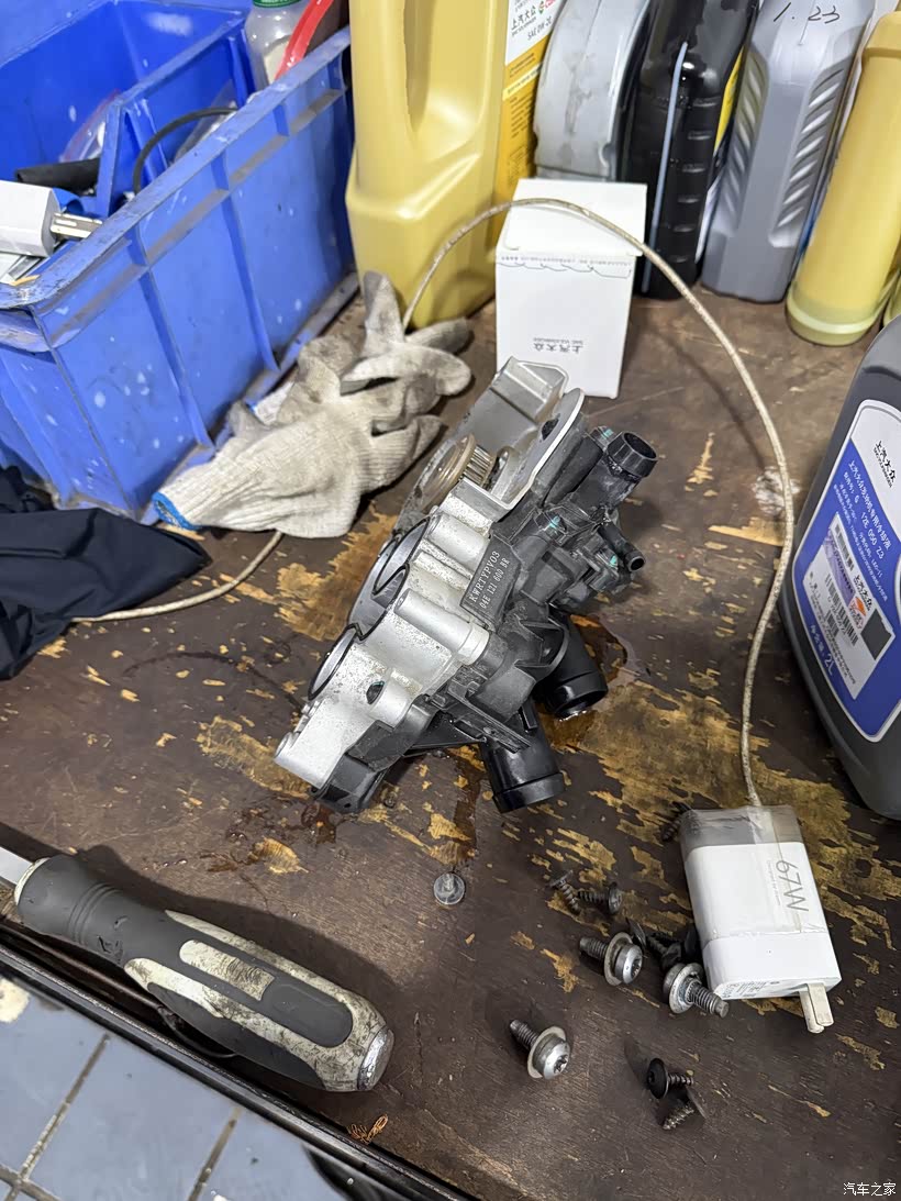 最后开始拆卸节温器水泵总成,虽然已经腾出很大空间来操作了,但是周围还分布着很多线路管道,不是很好操作,看来也是个苦活,这个节温器水泵总成上链接着4跟气管,师傅先后拆卸内循两根环进、排气管和外循环两根进、排气管,这外循环的两根进、排气管要粗大很多,这种进排气管都是用汽车卡箍卡紧的,还是比较好拆,然后就是拆节温器水泵总成的上的螺丝,拆完后从发动机上剥离节温器水泵总成时,防冻液哗哗流水一样泄露,我去看了下防冻液水壶,一下子就空了,估计仅剩管道中的一部分了。