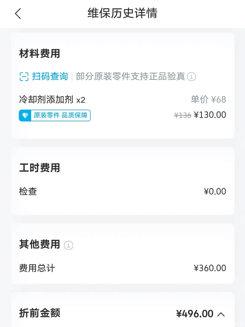 整个维修所花费就是第一次的更换防冻液和清洗水箱的500元,第二次更换节温器水泵总成是申请的延保索赔免费的,原本我想着车子购买了延保就来4S不会花钱吧,现在又因为他们的检测不到位,让我白花了第一次的500块钱,导致钱也花了时间也耽误了,中午把车送过去的,排队等位到下午5点才搞完,第二次更换节温器水泵总成8点多到的店,排队等位到上午9点多,搞到中午12点,这大众也不是那么让人省心省钱。