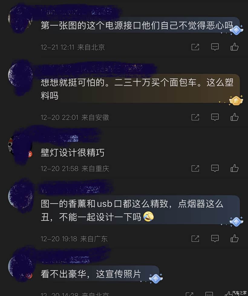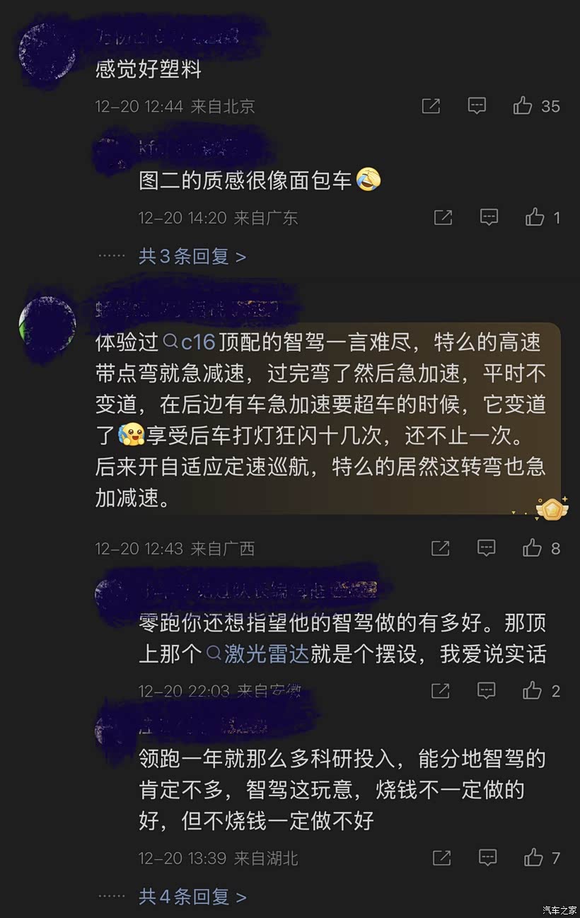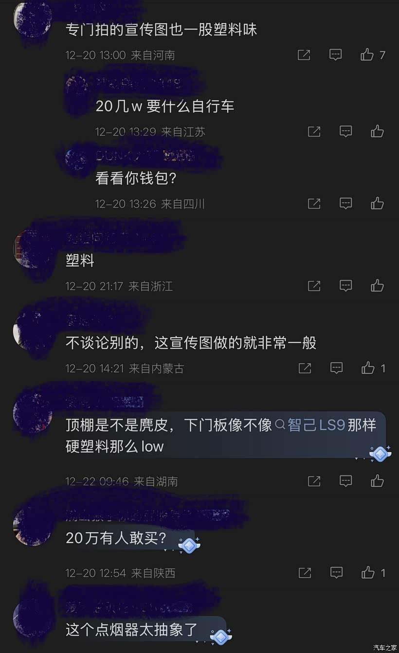 不光点烟器被批斗,还连带门板也被说是硬塑料,很low。甚至还有把吐槽延伸到不相关的智驾上,说智驾一言难尽,激光雷达是摆设。