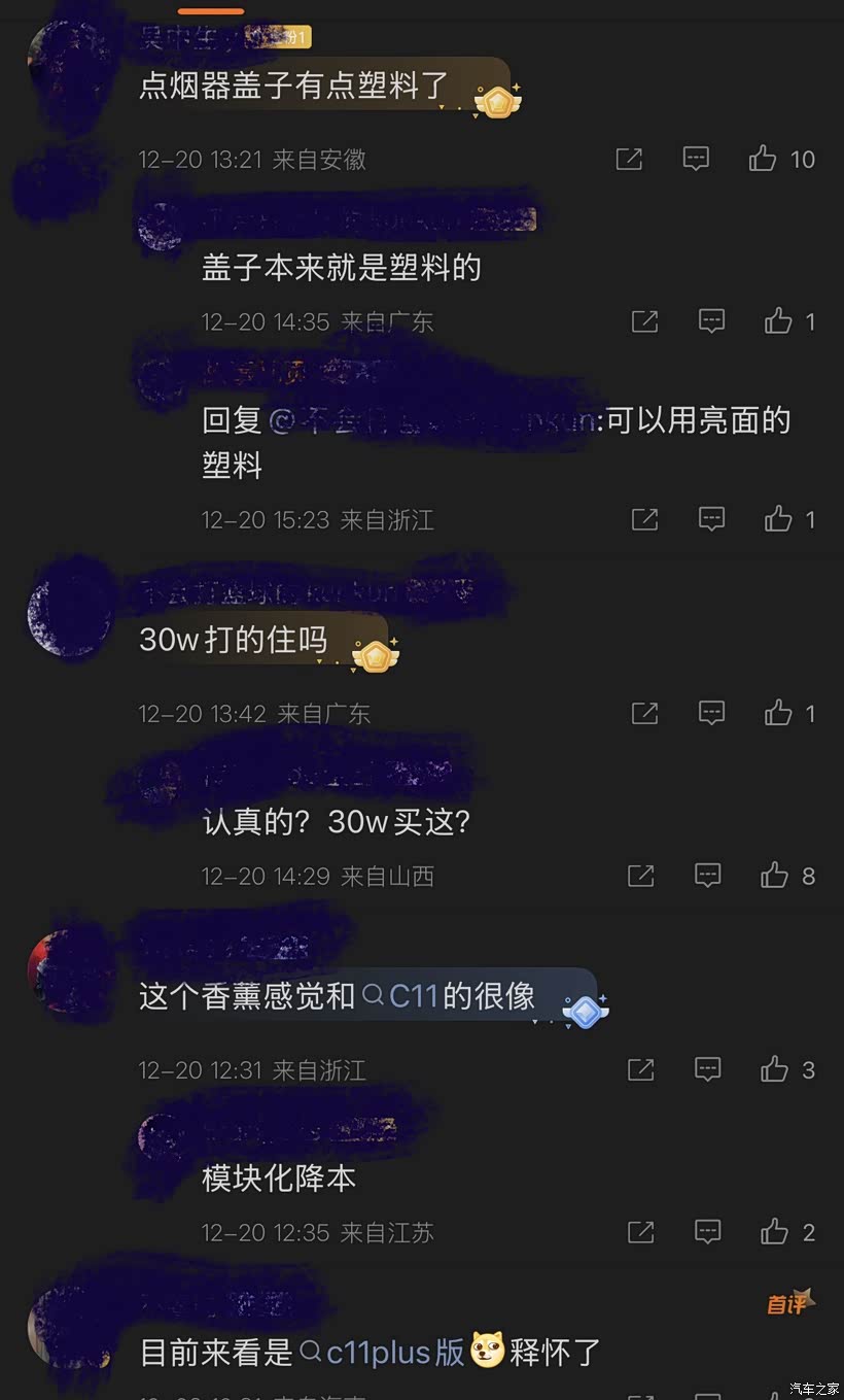 这次大家关注的点没在重点展示的香薰和氛围灯,而跑到了香薰旁边的点烟器上。这个点烟器应该是直接借用其他车型的产品,是通用的黑色塑料盖子方案,结果就是这个盖子让大家纷纷吐槽。