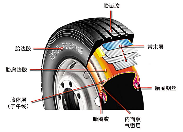 (7)胎面不易穿刺,不易爆胎。子午线胎的带束层非常强韧,使轮胎被钉子等扎穿的情况大致可减少一半。加上帘线强度得到充分利用,使其在恶劣的使用条件下,轮胎也不易发生爆破。