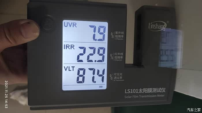 手机还是丢照片,施工当天拍的店铺的照片不见了,万幸仪器测试的照片都没丢。前后挡和天窗我这个仪器测试不到,所以没法给参数,只能单独测试前挡膜和侧后挡膜两种膜的参数比较,中间还有一块废旧玻璃的测试参数。话不多说了直接上图吧,参数和结果直接看图片。